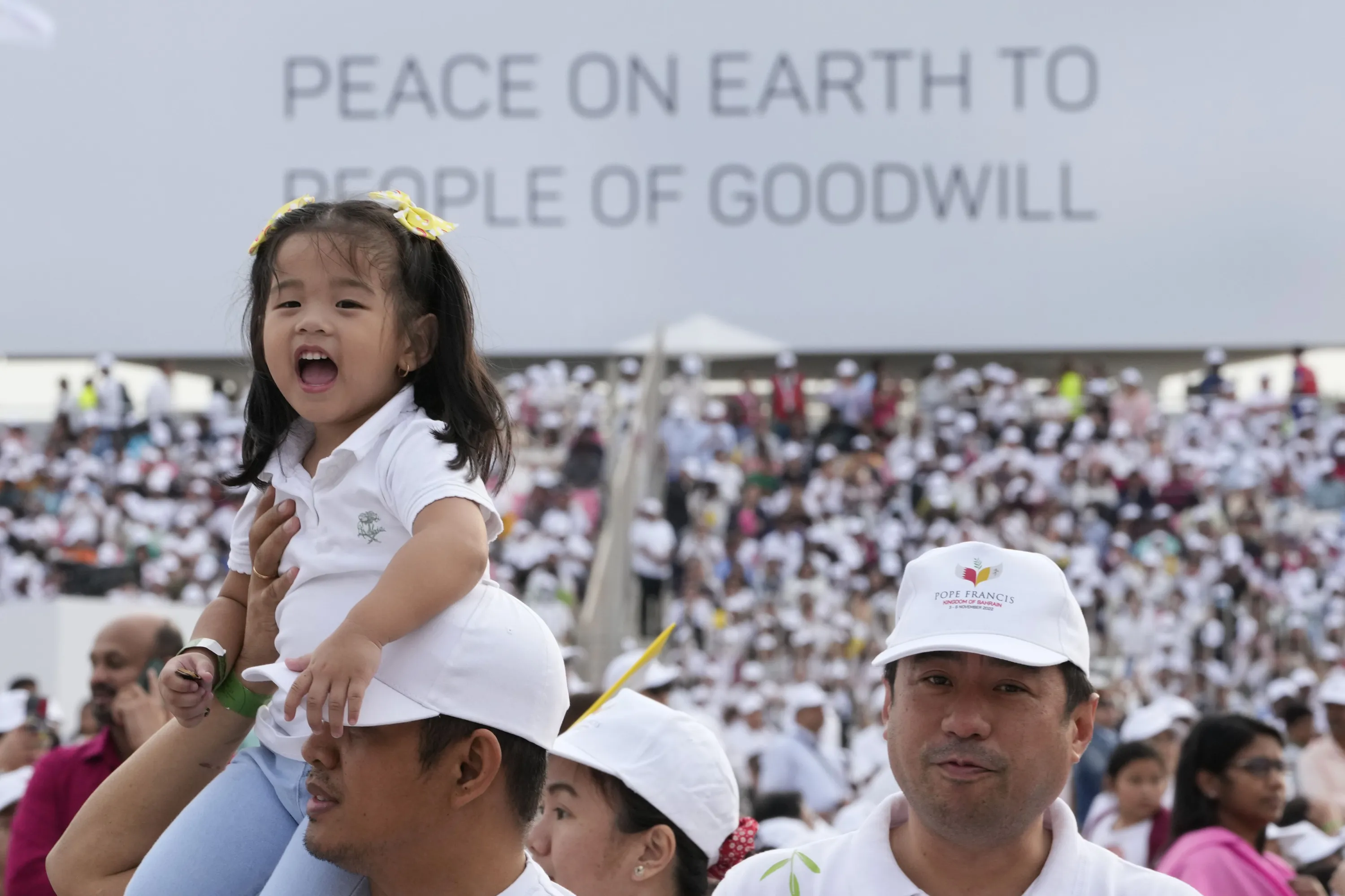 A girl sings on the shoulder of her father who arrived to attend a Holy Mass that will be held by Pope Francis at Bahrain National Stadium in Manama, Bahrain, Saturday, November 5, 2022. (Photo by Hussein Malla/AP Photo)