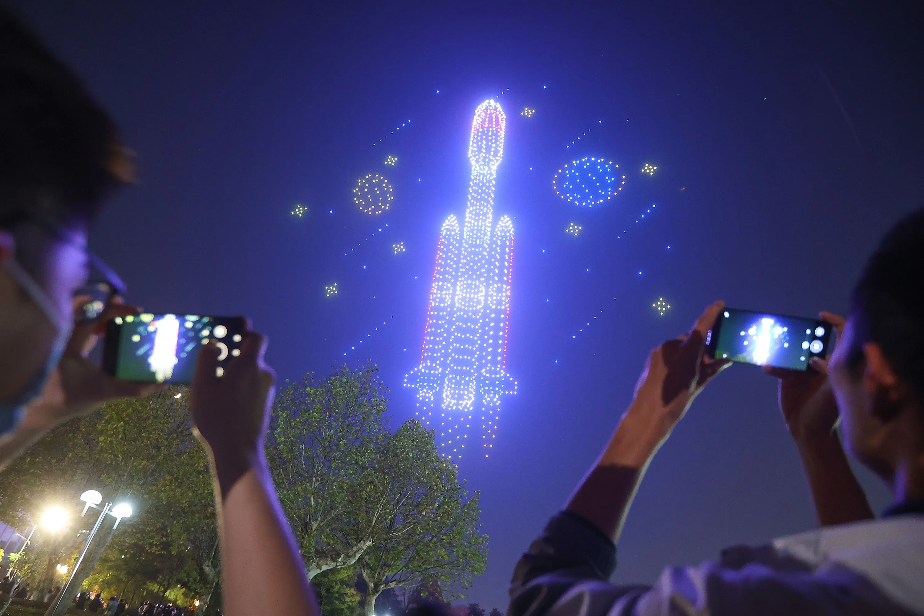 A total of 2,022 drones form a rocket-shaped pattern during a light show to celebrate the 70th founding anniversary of Nanjing University of Aeronautics and Astronautics on October 30, 2022 in Nanjing, Jiangsu Province of China. (Photo by Yang Bo/China News Service via Getty Images)