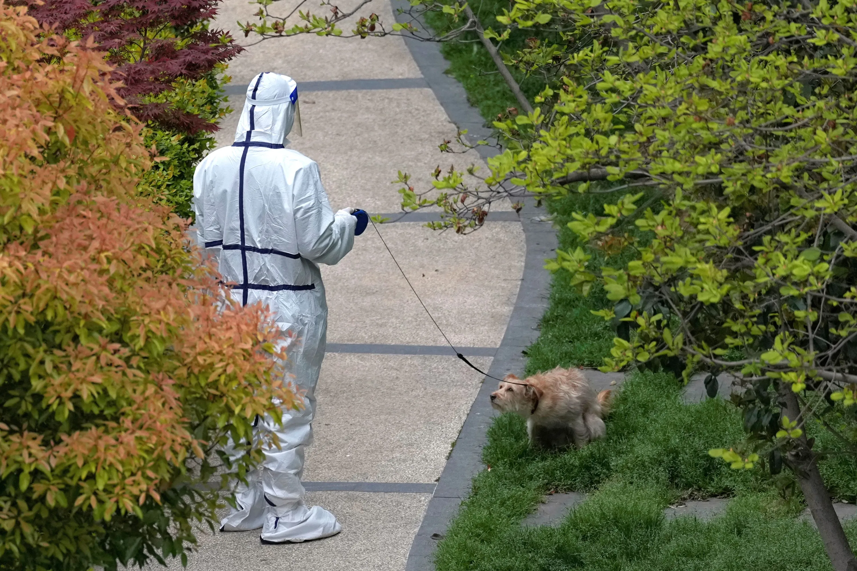 A person in a protective suit walks a dog in a residential area under lockdown, amid the coronavirus disease (COVID-19) pandemic, in Shanghai, China on April 5, 2022. (Photo by Aly Song/Reuters)