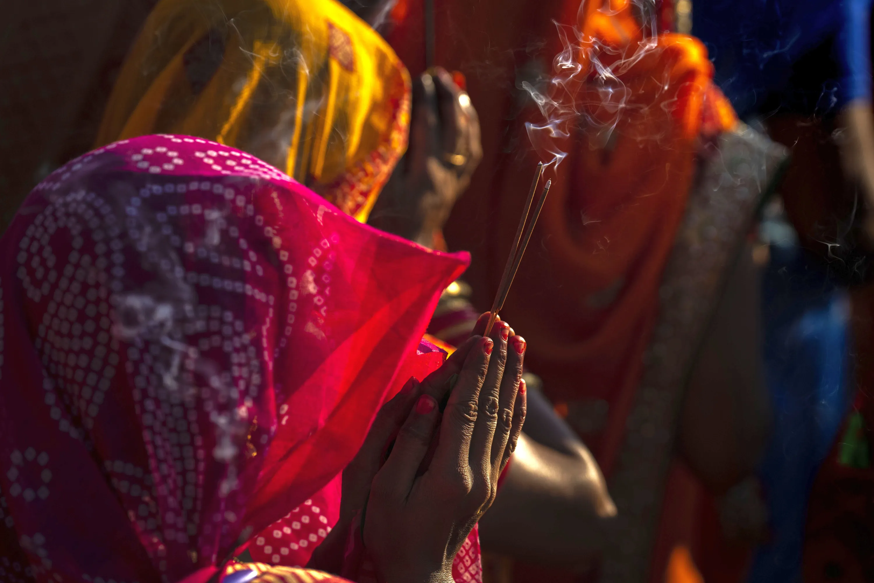Hindu devotees gather by the river Brahmaputra and offer prayers during Chhath Puja festival in Guwahati, northeastern Assam state, India, Sunday, October 30, 2022. During Chhath, an ancient Hindu festival, rituals are performed to thank the Sun god for sustaining life on earth. (Photo by Anupam Nath/AP Photo)
