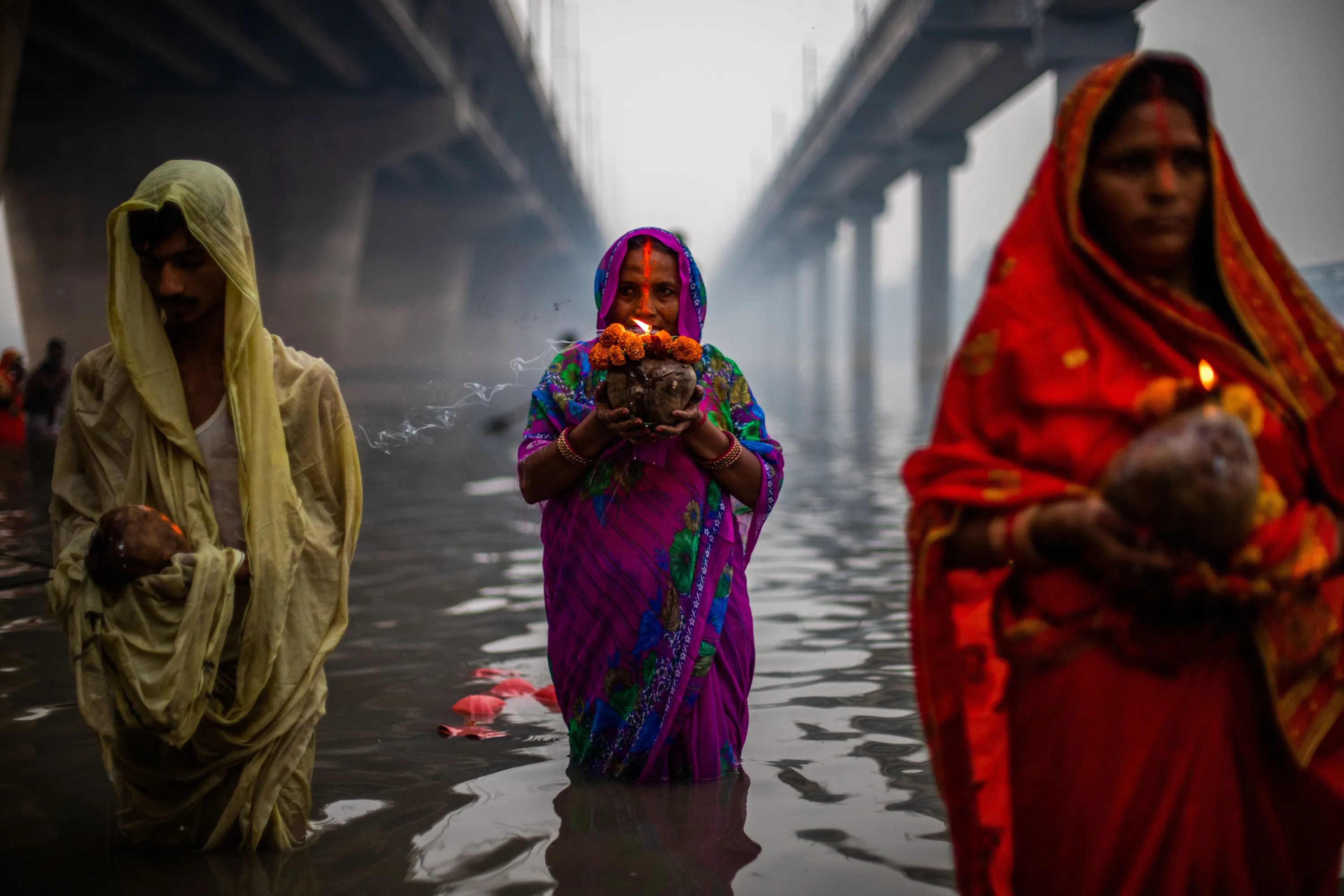 Hindu devotees perform rituals to the Sun god in the river Yamuna during Chhath Parva Festival in Noida the outskirts of New Delhi, India on October 31, 2022. Chhath puja, an ancient Hindu festival, rituals are performed to thank the Sun god for sustaining life on earth. (Photo by Amarjeet Kumar Singh/Anadolu Agency via Getty Images)