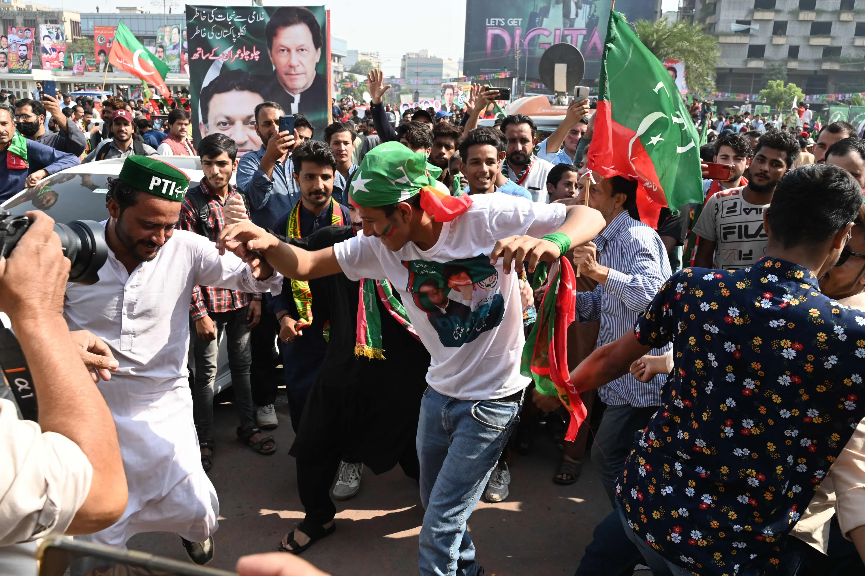 Activists and supporters of opposition party Pakistan Tehreek-e-Insaf (PTI) dance before the start of an anti-government long march towards Islamabad to demand early elections, in Lahore on October 28, 2022. Former Pakistan prime minister Imran Khan launched a so-called “long march” Friday on the capital Islamabad to demand early elections, piling pressure on a government already in crisis. (Photo by Arif Ali/AFP Photo)