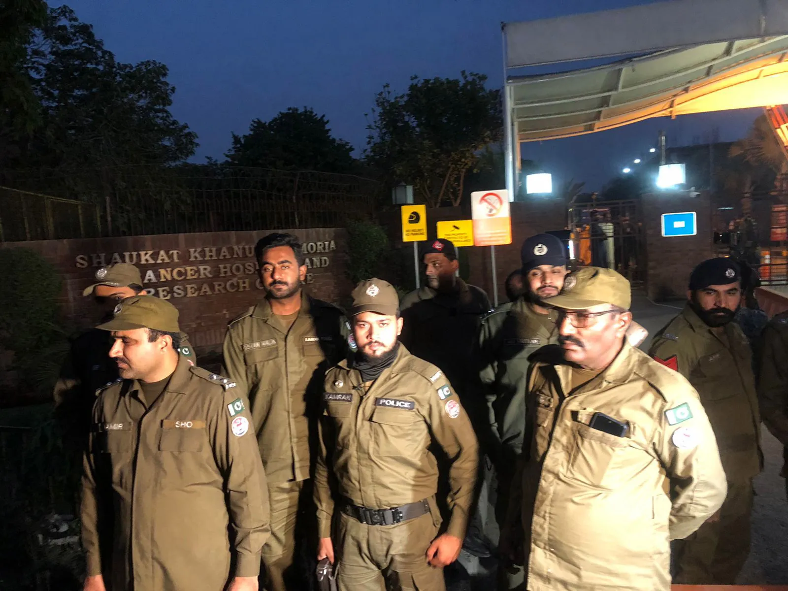 Police stands guard outside the Shaukat Khanum hospital where former Prime Minister Imran Khan, who suffered bullet injuries during a protest march near Wazirabad, is shifted to for treatment, in Lahore, Pakistan, 03 November 2022. Pakistan's former prime minister Imran Khan suffered a gunshot wound on 03 November after an unidentified attacker opened fire on a crowded rally led by the politician, officials said. The former prime minister is leading a long march from Lahore to the capital Islamabad to pressure the government for early elections in the country. (Photo by Rahat Dar/EPA/EFE)