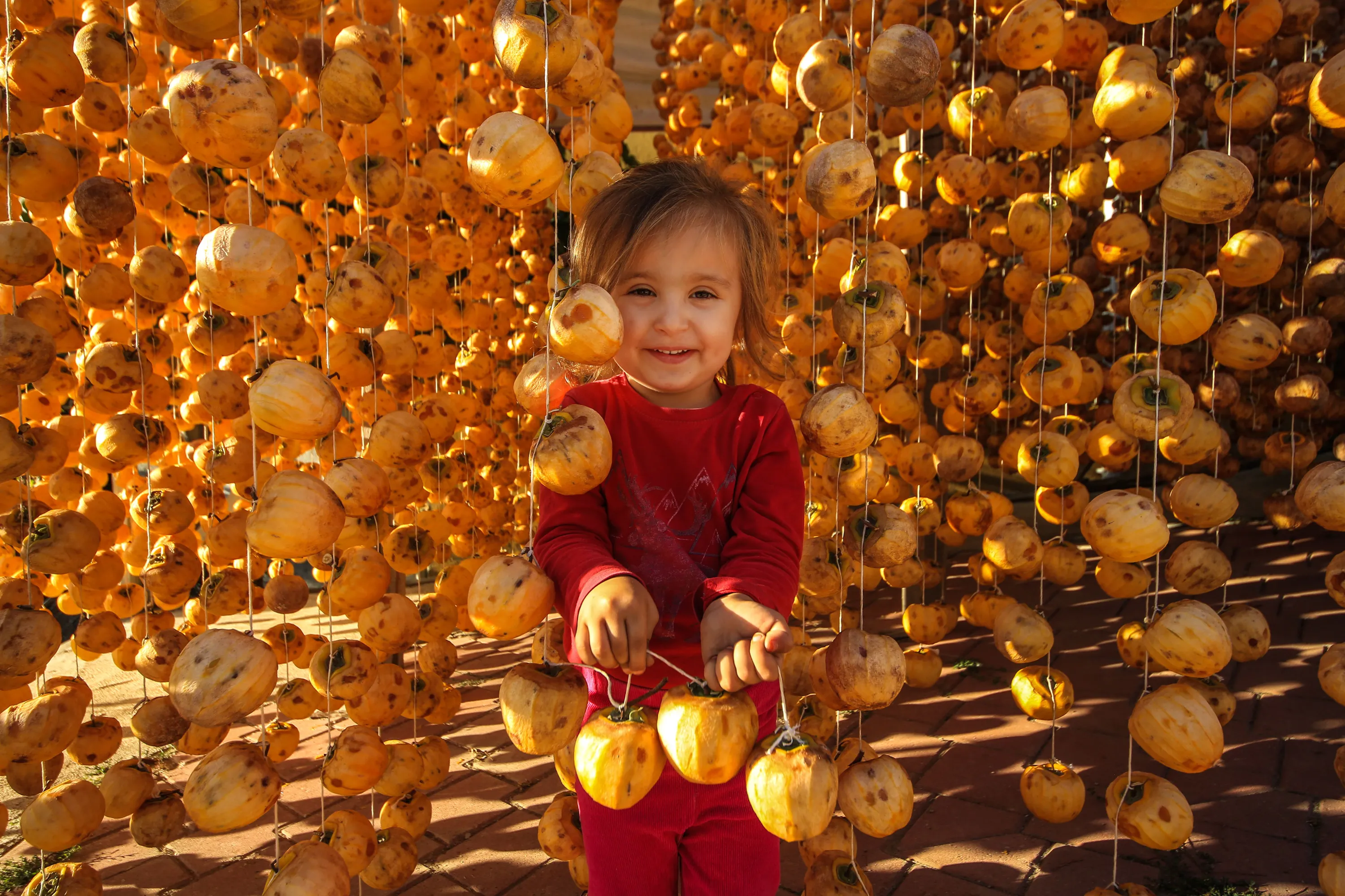 A child is seen with persimmons in Denizli, Turkiye on October 24, 2022. (Photo by Ummu Nisan Kandilcioglu/Anadolu Agency via Getty Images)