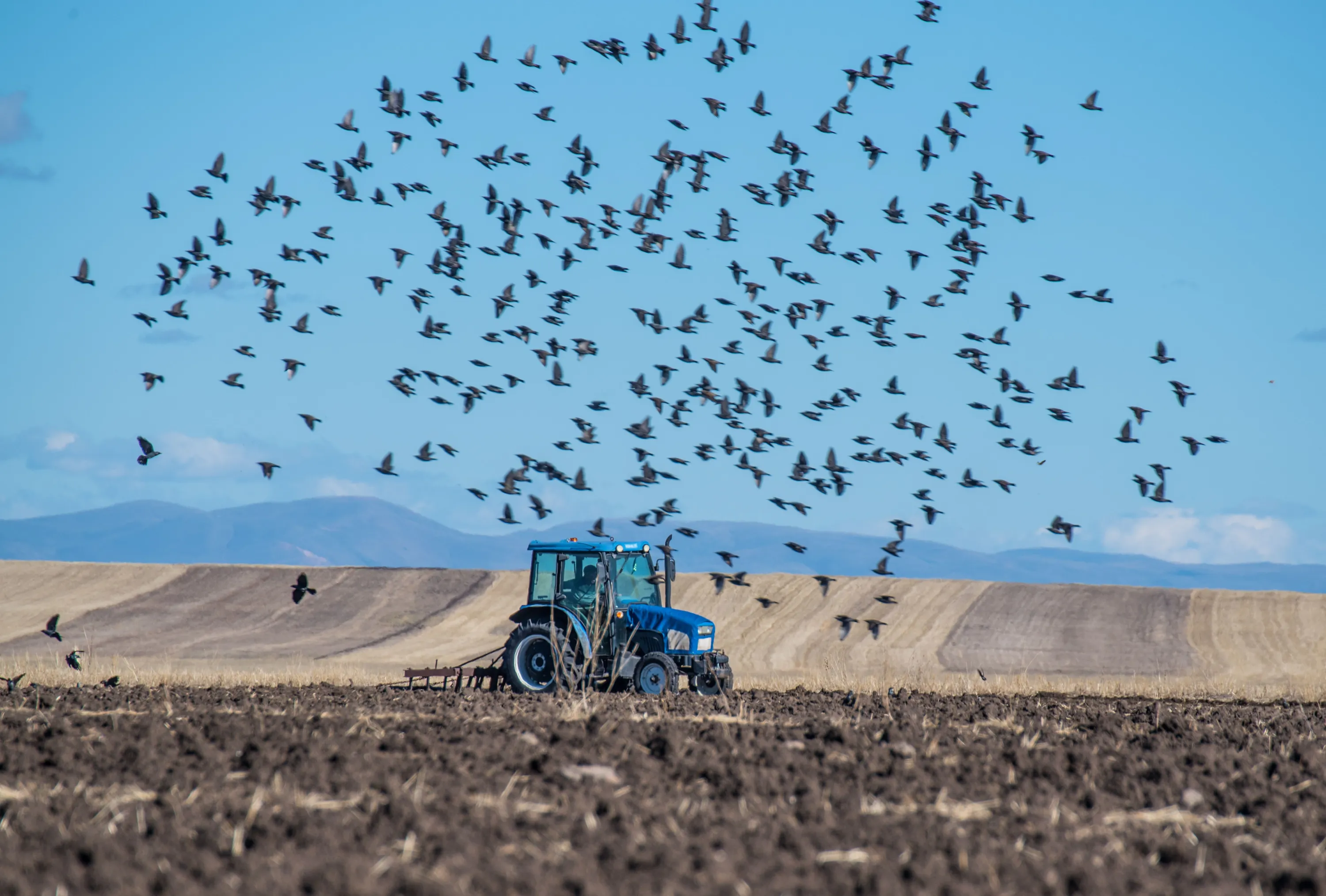 A man drives a tractor plowing the field after harvest season as birds fly over it to catch some seeds and insects in Kars, Turkiye on October 25, 2022. (Photo by Ismail Kaplan/Anadolu Agency via Getty Images)