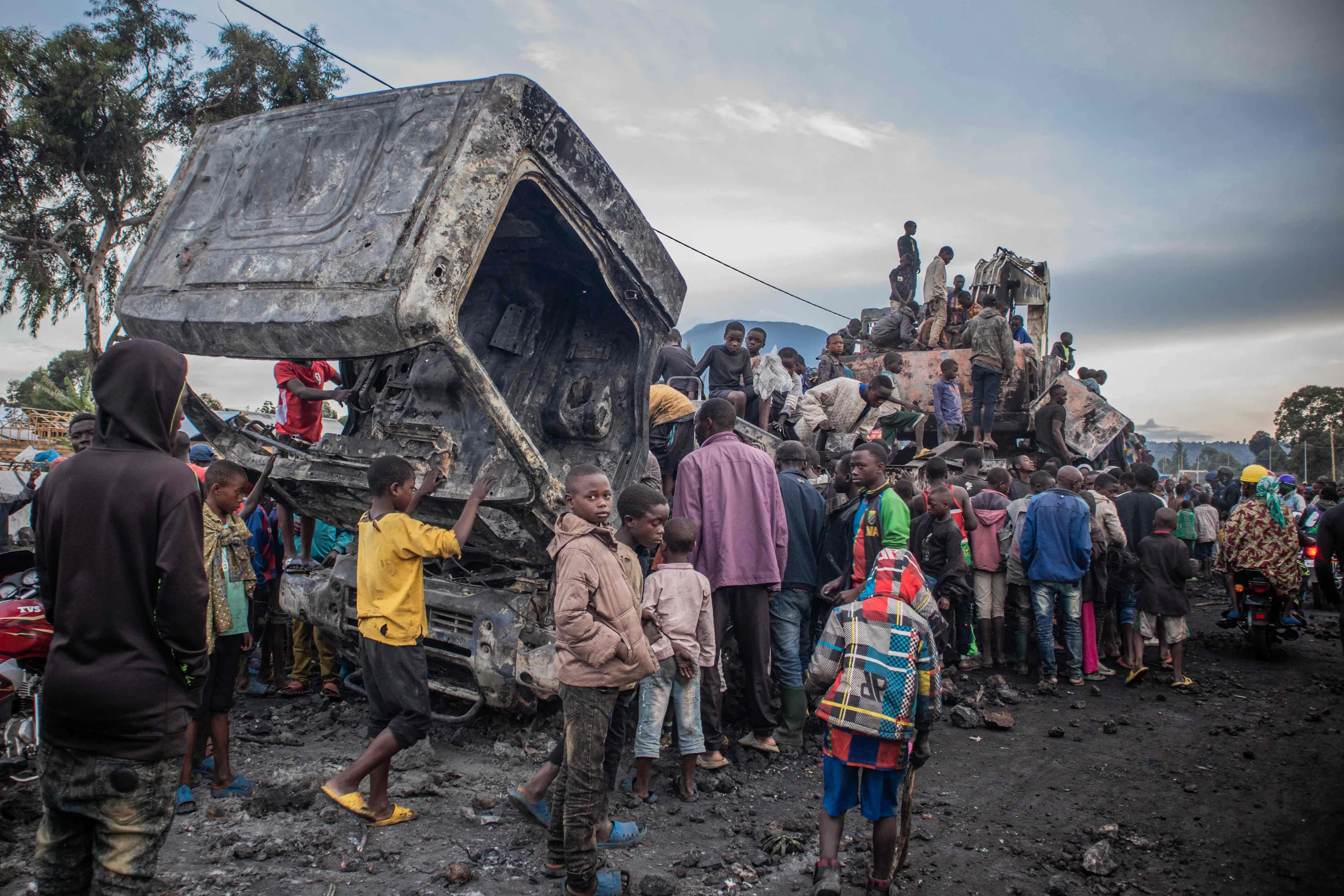 Residents dismantle a vehicle belonging to the United Nations Organization Stabilization Mission in the Democratic Republic of the Congo (MONUSCO) in Kanyaruchinya, part of Nyiragongo territory in the Democratic Republic of Congo, on November 2, 2022, after it was set on fire overnight by angry residents. (Photo by Aubin Mukoni/AFP Photo)