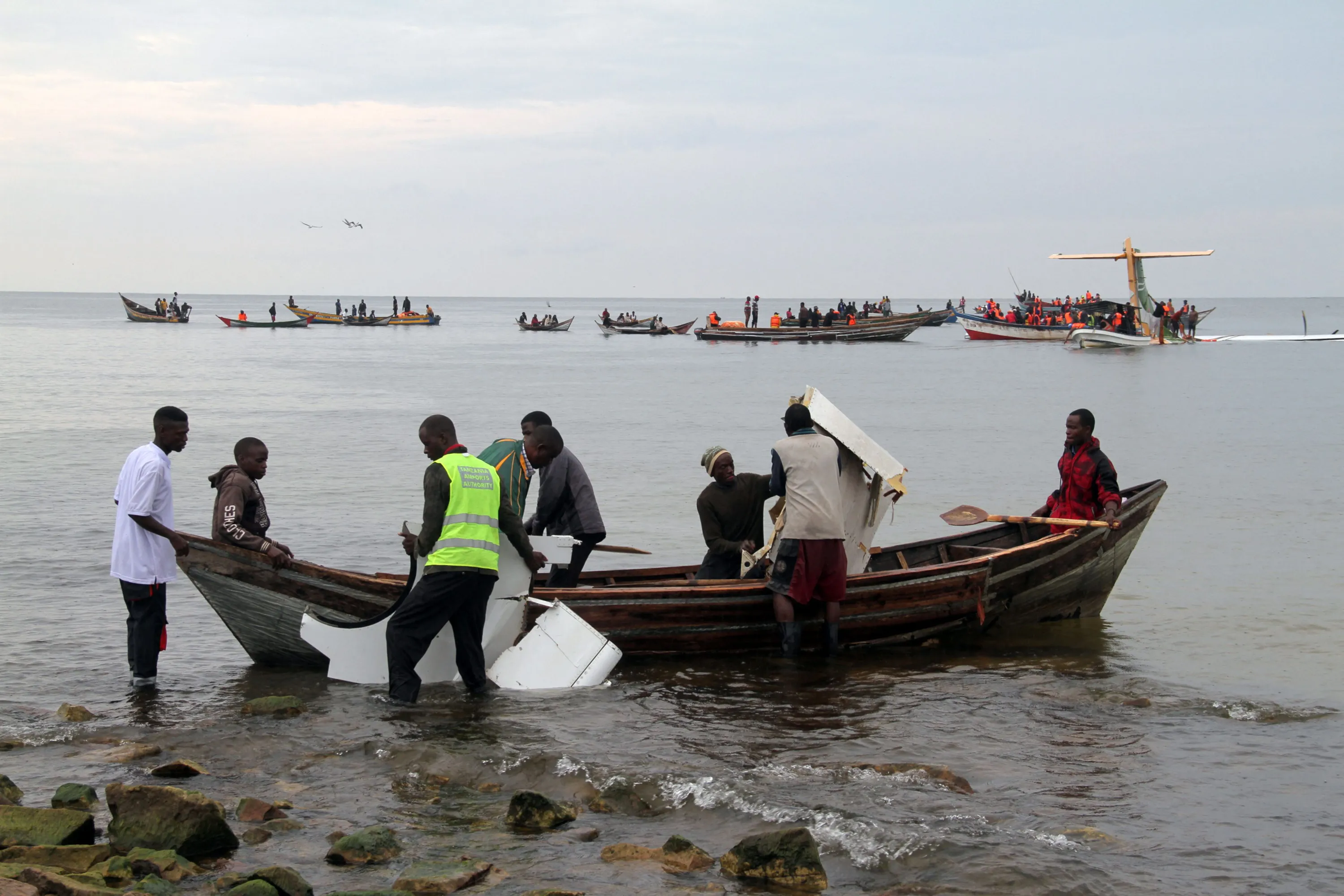 Rescuers carry debris as they search for survivors after a Precision Air flight that was carrying 43 people plunged into Lake Victoria as it attempted to land in the lakeside town of Bukoba, Tanzania on November 6, 2020. (Photo by Sitide Protase/AFP Photo)