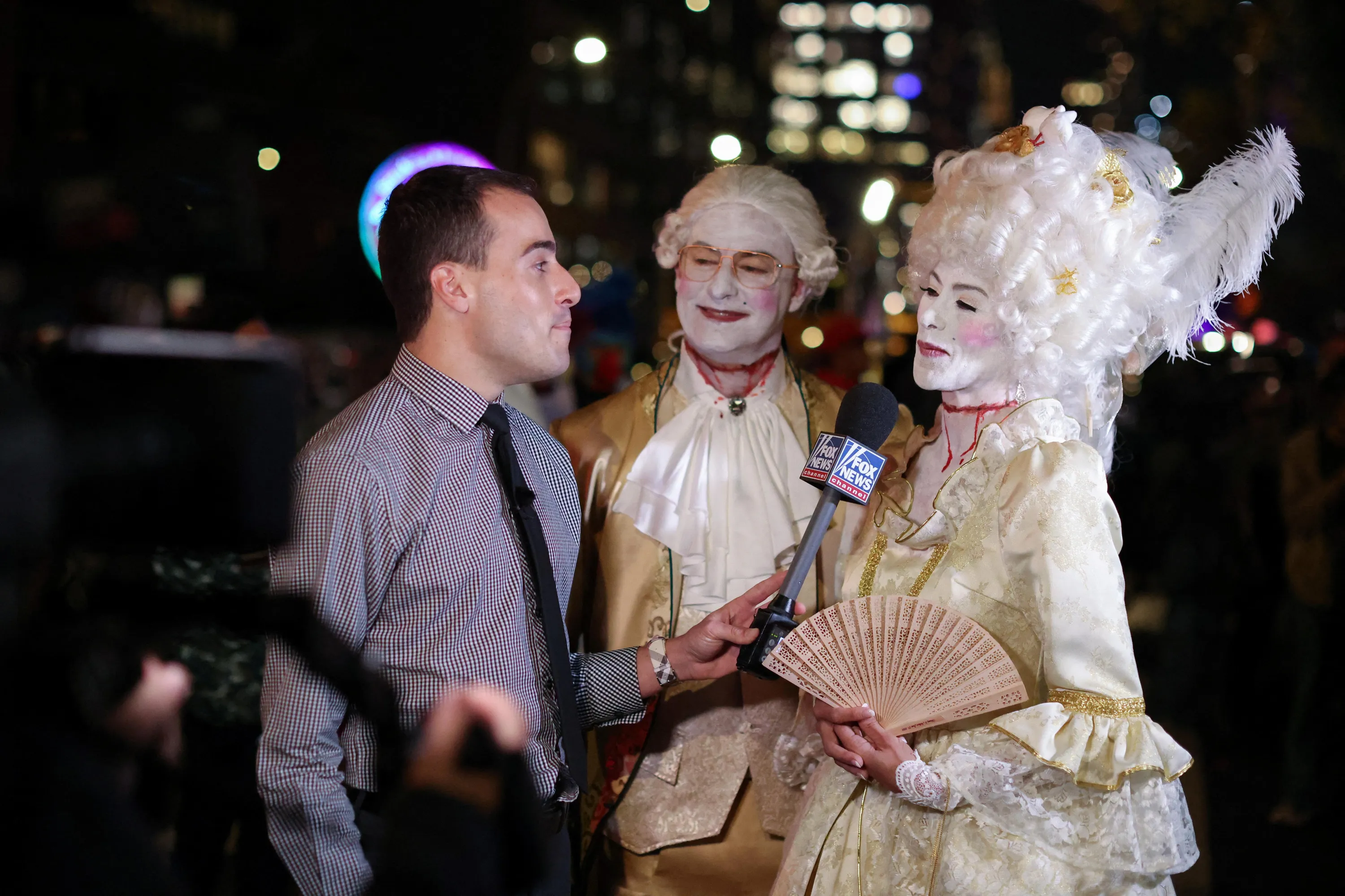 People in costume react as they're interviewed by media as they attend New York's Annual Village Halloween Parade in Manhattan, New York City, U.S., October 31, 2022. (Photo by Andrew Kelly/Reuters)