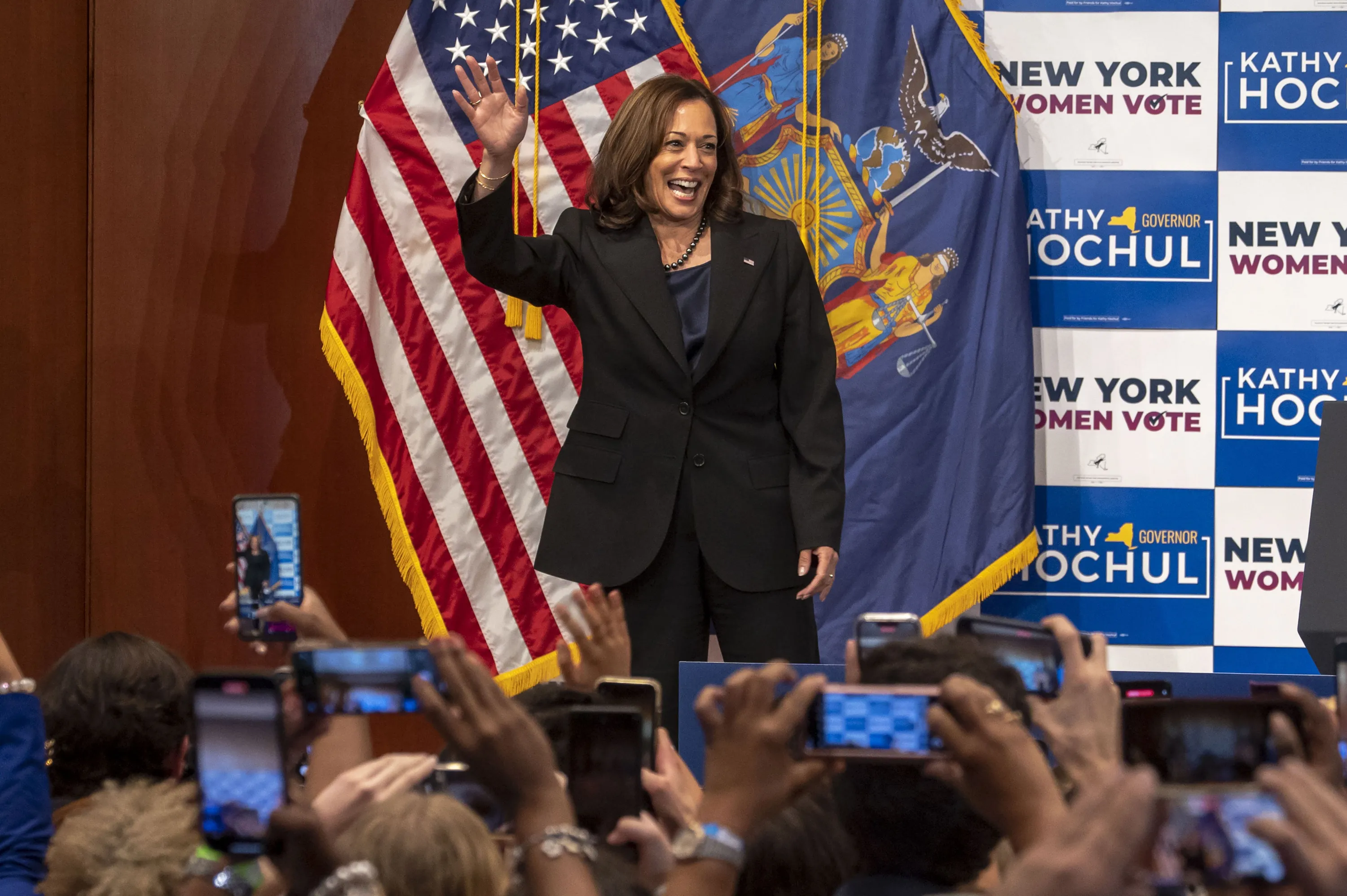 Vice President Kamala Harris greets the crowd as she takes the stage during a New York Women “Get Out The Vote” rally at Barnard College in New York City on November 3, 2022. Vice President Kamala Harris and Secretary Hillary Rodham Clinton joined Gov. Kathy Hochul and Attorney General Letitia James as they campaigned at a New York Women GOTV rally with the midterm elections under a week away. Hochul holds a slim lead in the polls against Republican candidate Rep. Lee Zeldin. AG James is favored to beat Republican candidate for Attorney General Michael Henry. (Photo by Ron Adar/SOPA Images/Rex Features/Shutterstock)