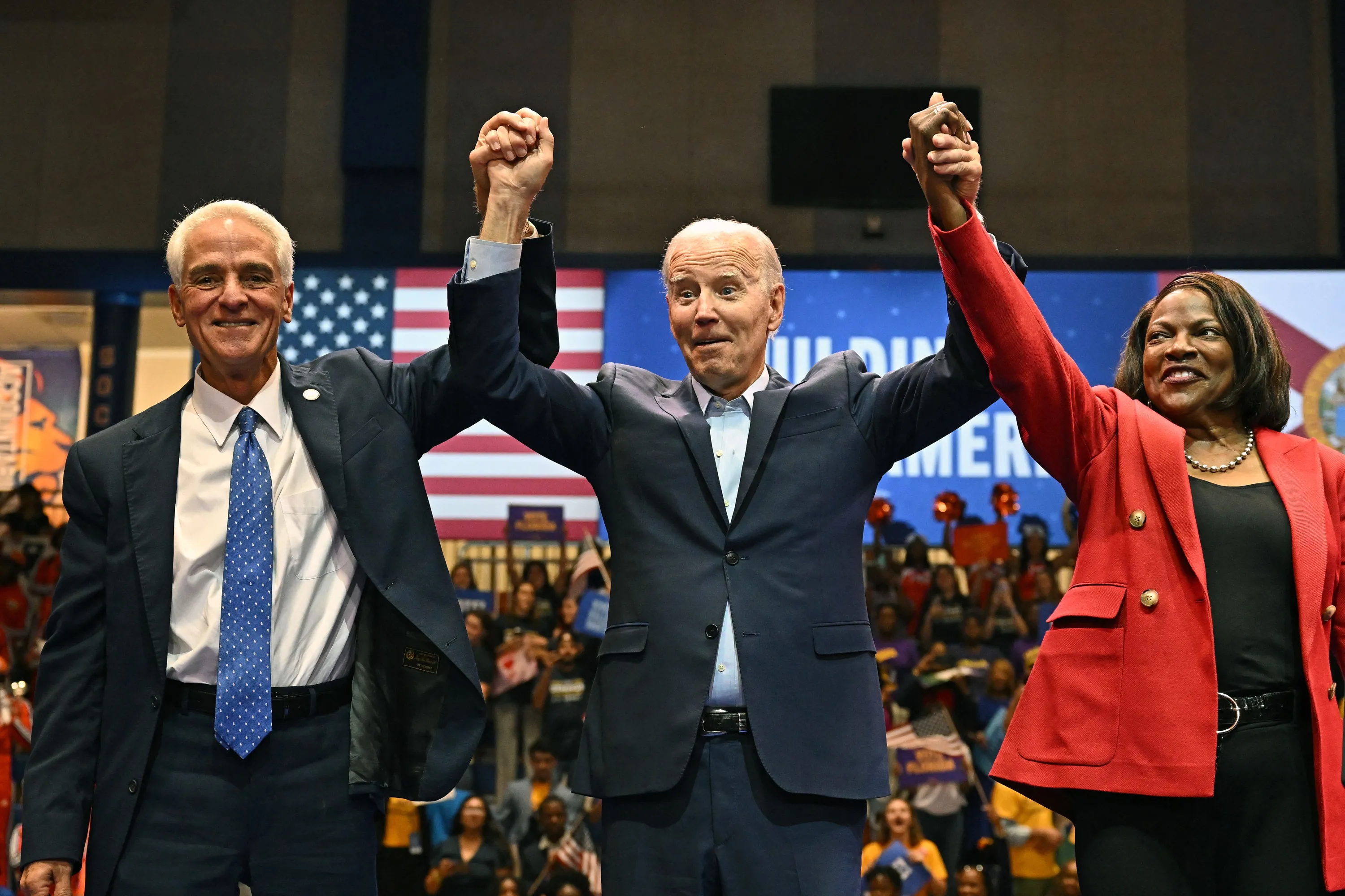 Charlie Crist (L), Democratic Gubernatorial candidate for Florida, US President Joe Biden (C) and Val Demings, Democratic Senatorial candidate for Florida acknowledge the crowd during a Democratic National Committee reception at Florida Memorial University in Miami Gardens, Florida, on November 1, 2022. (Photo by Jim Watson/AFP Photo)