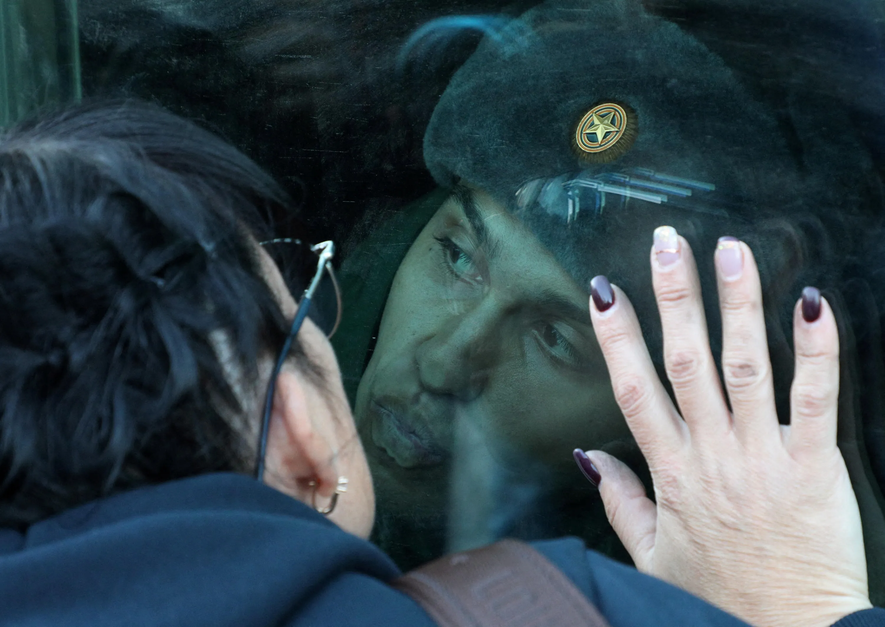 A conscript kisses the window of a train carriage as he says goodbye to family members at a local railway station during departure for the garrisons, in Sevastopol, Crimea on November 9, 2022. (Photo by Alexey Pavlishak/Reuters)