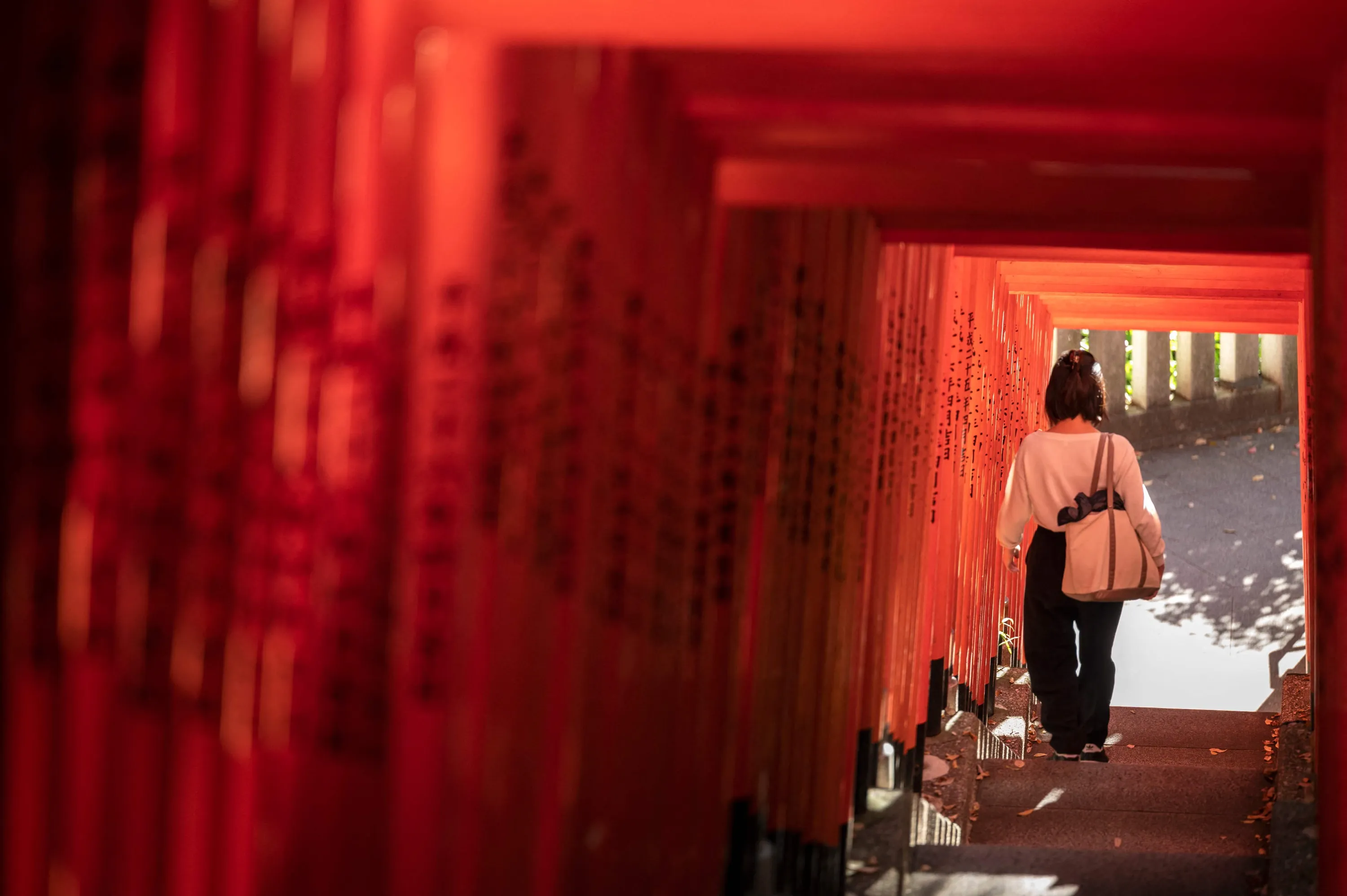 A young woman walks down stairs under a line of red “torii” or gates during a visit to Hie Shrine in central Tokyo on November 3, 2022, as the country marks the Culture Day public holiday. (Photo by Richard A. Brooks/AFP Photo)