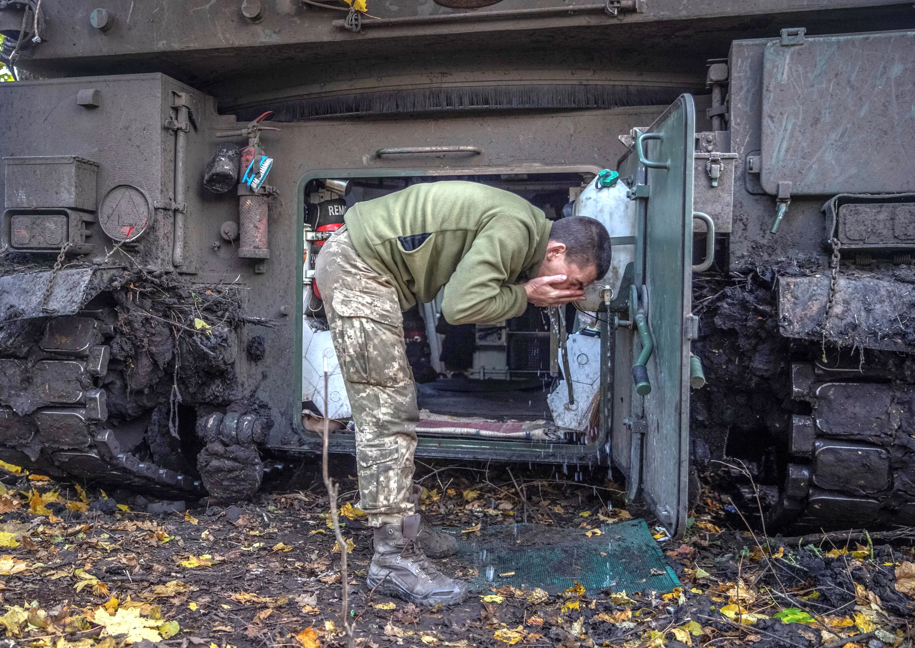 Ukrainian serviceman washes his face near a Polish self-propelled howitzer Krab after a fire toward Russian positions, amid Russia's attack on Ukraine, on a frontline in Donetsk region, Ukraine on November 8, 2022. (Photo by Oleksandr Ratushniak/Reuters)