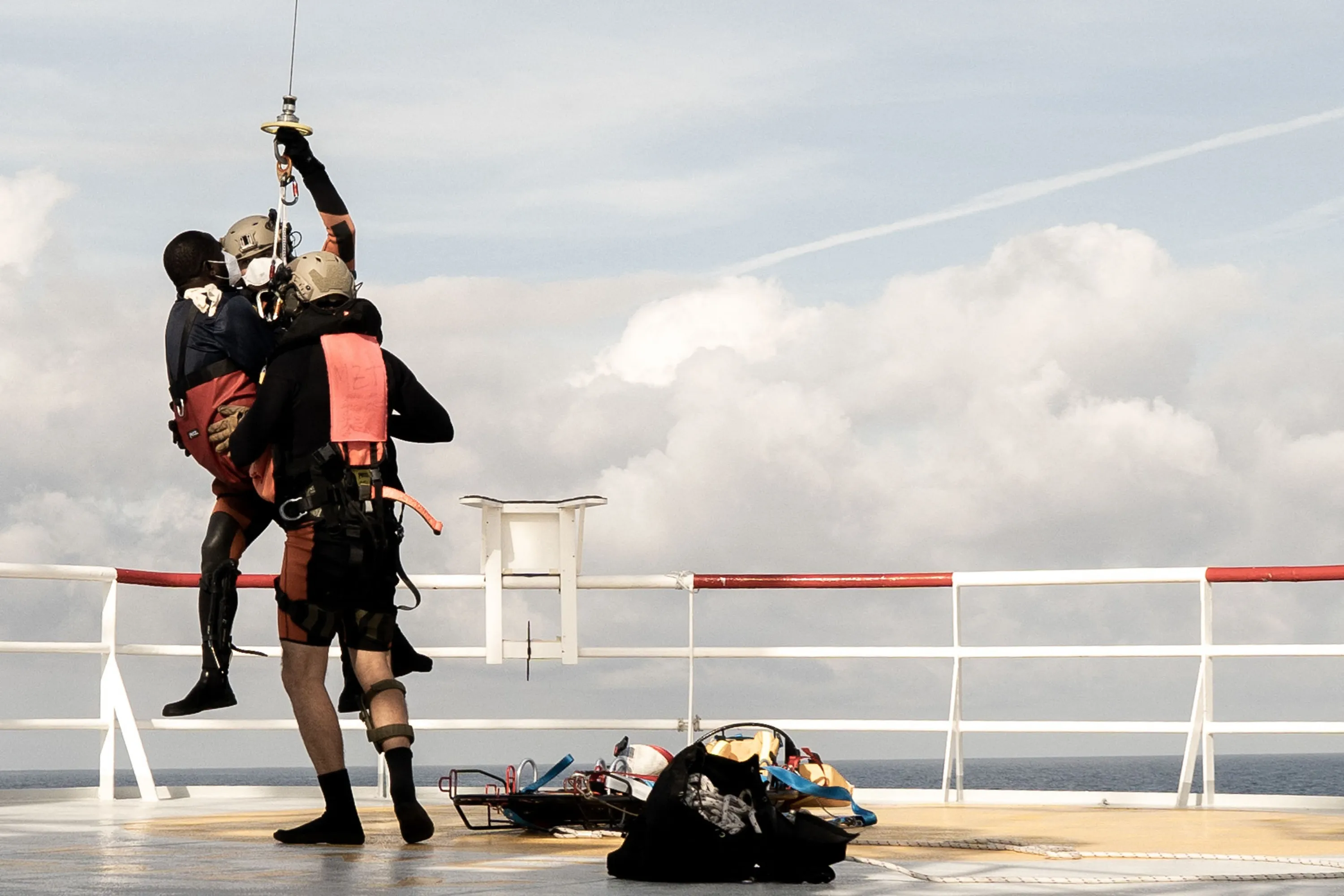 A migrant in need of urgent medical care (C) is winched up by a helicopter of the French Army from the Ocean Viking rescue ship on November 10, 2022 in the Tyrrhenian Sea between Italy and Corsica island. French authorities said on November 10, 2022 they would evacuate three migrants from the Ocean Viking rescue ship in need of urgent medical care, plus one caregiver, amid a standoff between France and Italy over where the rest of the passengers should disembark. (Photo by Vincenzo Circosta/AFP Photo)