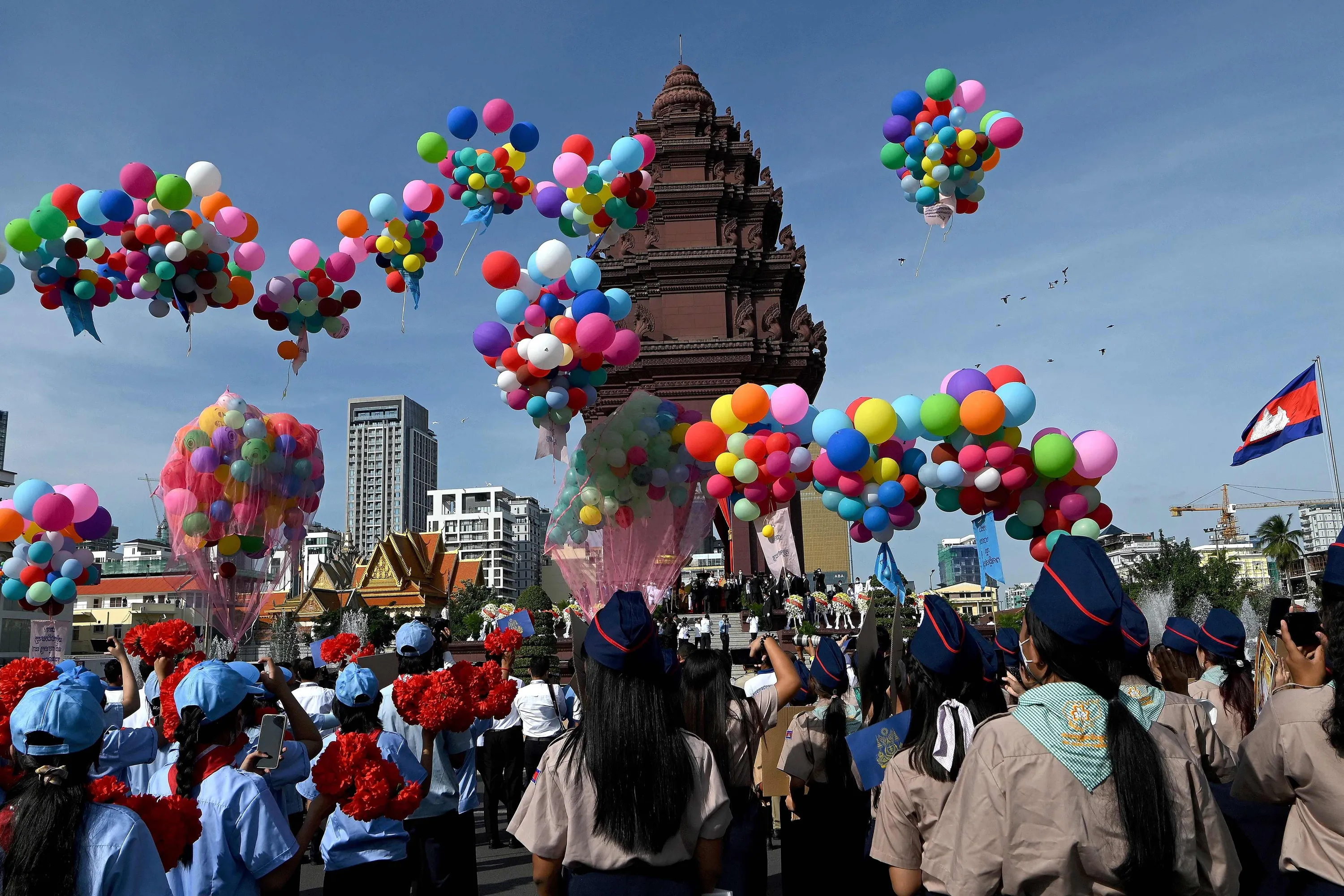 Balloons are released at the Independence Monument during a ceremony marking Cambodia's 69th Independence Day celebrations in Phnom Penh on November 9, 2022. (Photo by Tang Chhin Sothy/AFP Photo)