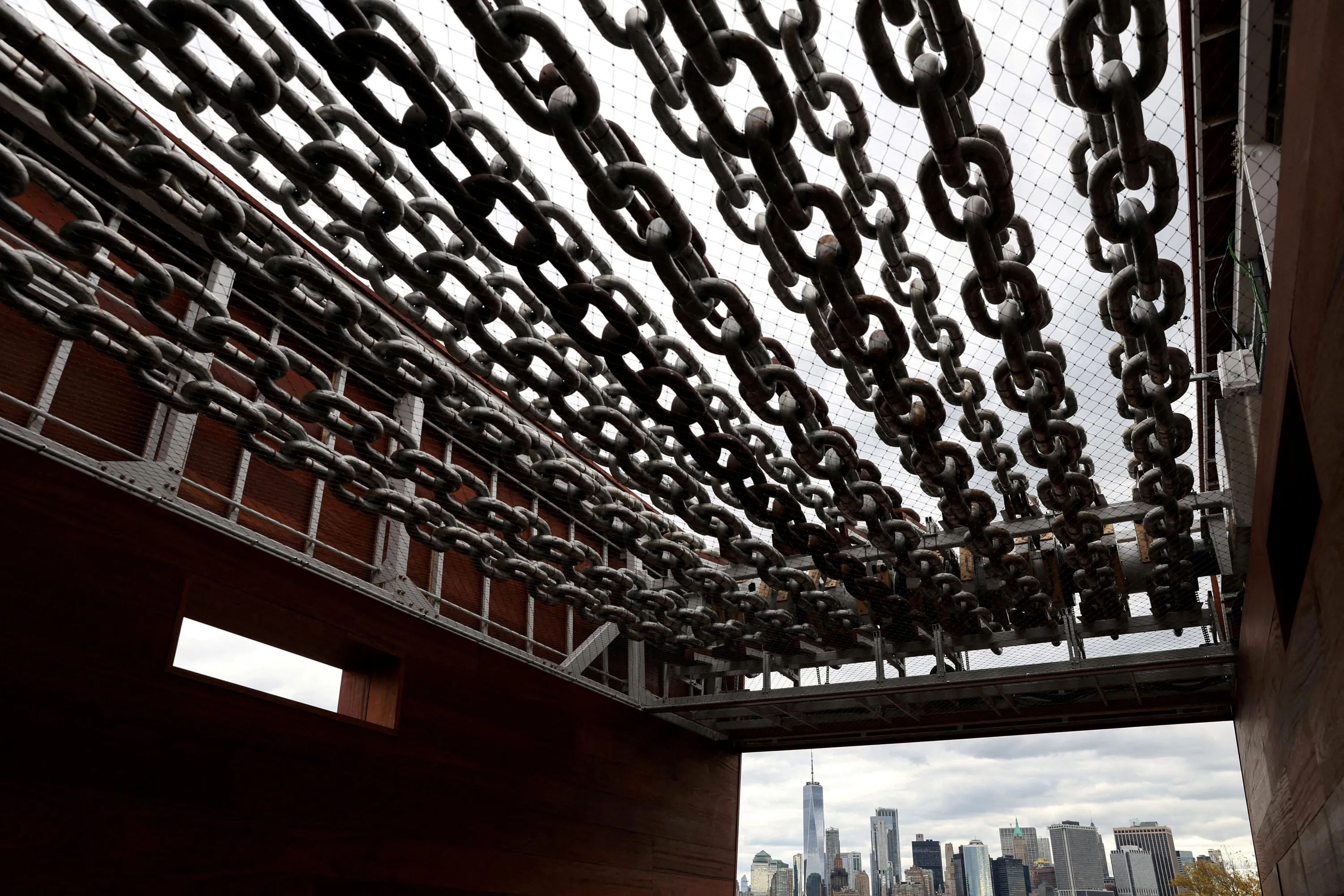 American artist Charles Gaines' second chapter of The American Manifest titled Moving Chains, a 110-foot long kinetic sculpture built from steel and sustainably harvested African Mahogany, is seen on Governors Island in the New York Harbor of New York City, U.S., October 19, 2022. (Photo by Shannon Stapleton/Reuters)