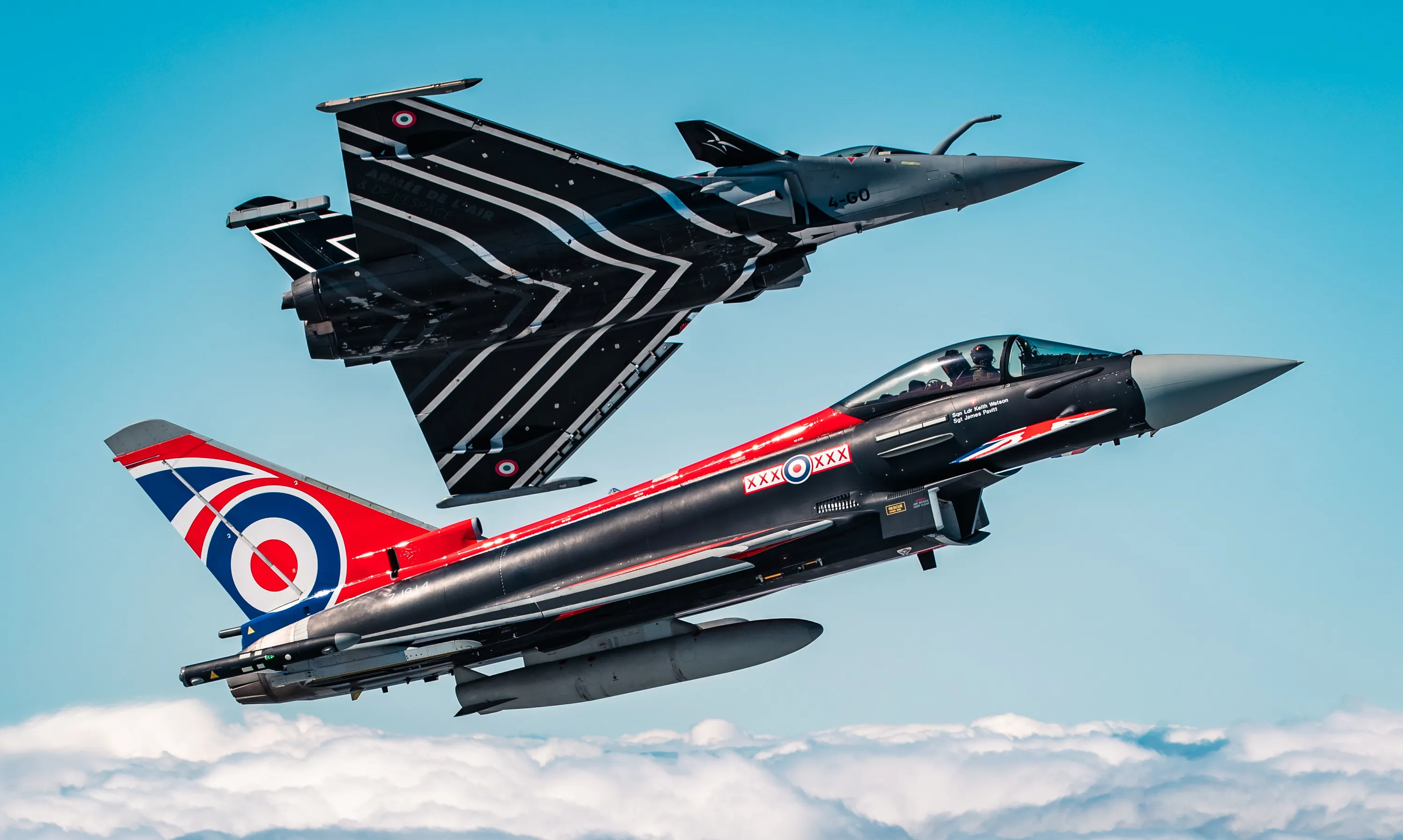 Undated handout photo issued by the Ministry of Defence (MoD) of an RAF Typhoon (nearest camera) flying with a French Air Force Rafale, both aircraft are from their respective display teams. After a 3-year Covid-enforced break, the RAF Cosford Air Show will take place on 12 June 2022. Issue date: Friday June 10, 2022. PA Photo. (Photo by Cpl Lee Matthews/Ministry of Defence Crown copyright/PA Wire)