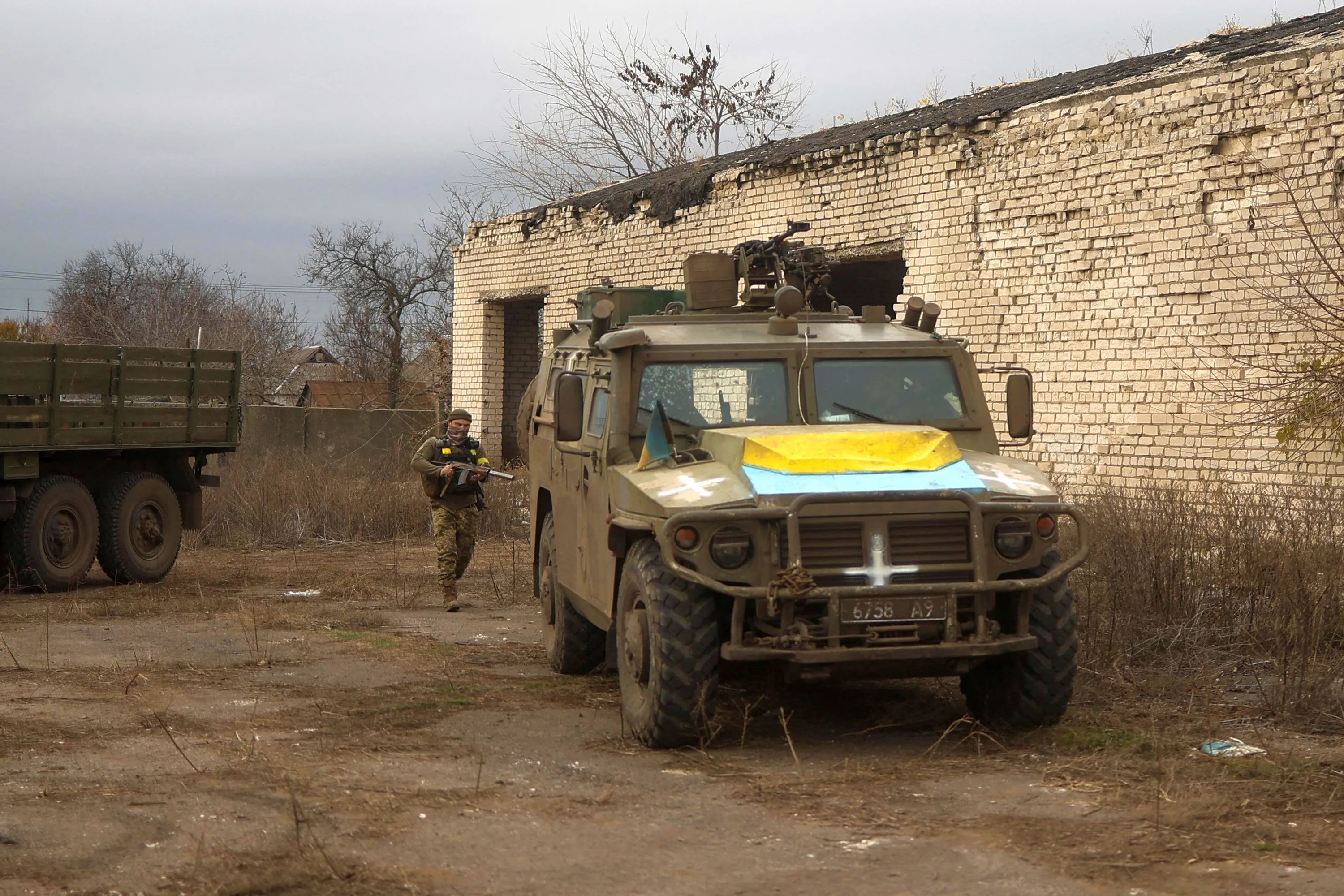 A Ukrainian service member stands next to a previously captured Russian armoured personnel carrier in the village of Blahodatne, retaken by the Ukrainian Armed Forces a day ago, amid Russia's attack on Ukraine, in Kherson region, Ukraine on November 11, 2022. (Photo by Valentyn Ogirenko/Reuters)