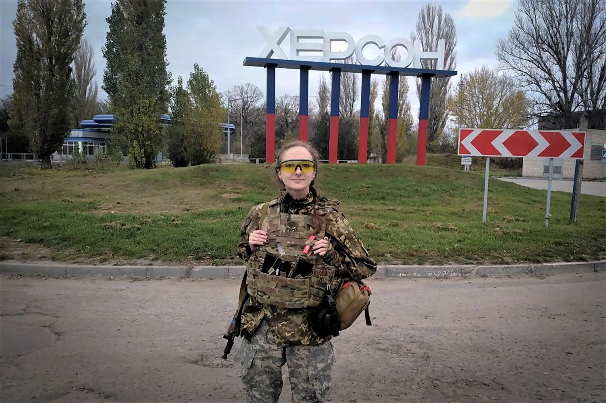 A Ukrainian female soldier poses for a photo against a Kherson sign in the background, in Kherson, Ukraine, Friday, November 11, 2022. (Photo by Dagaz/AP Photo)