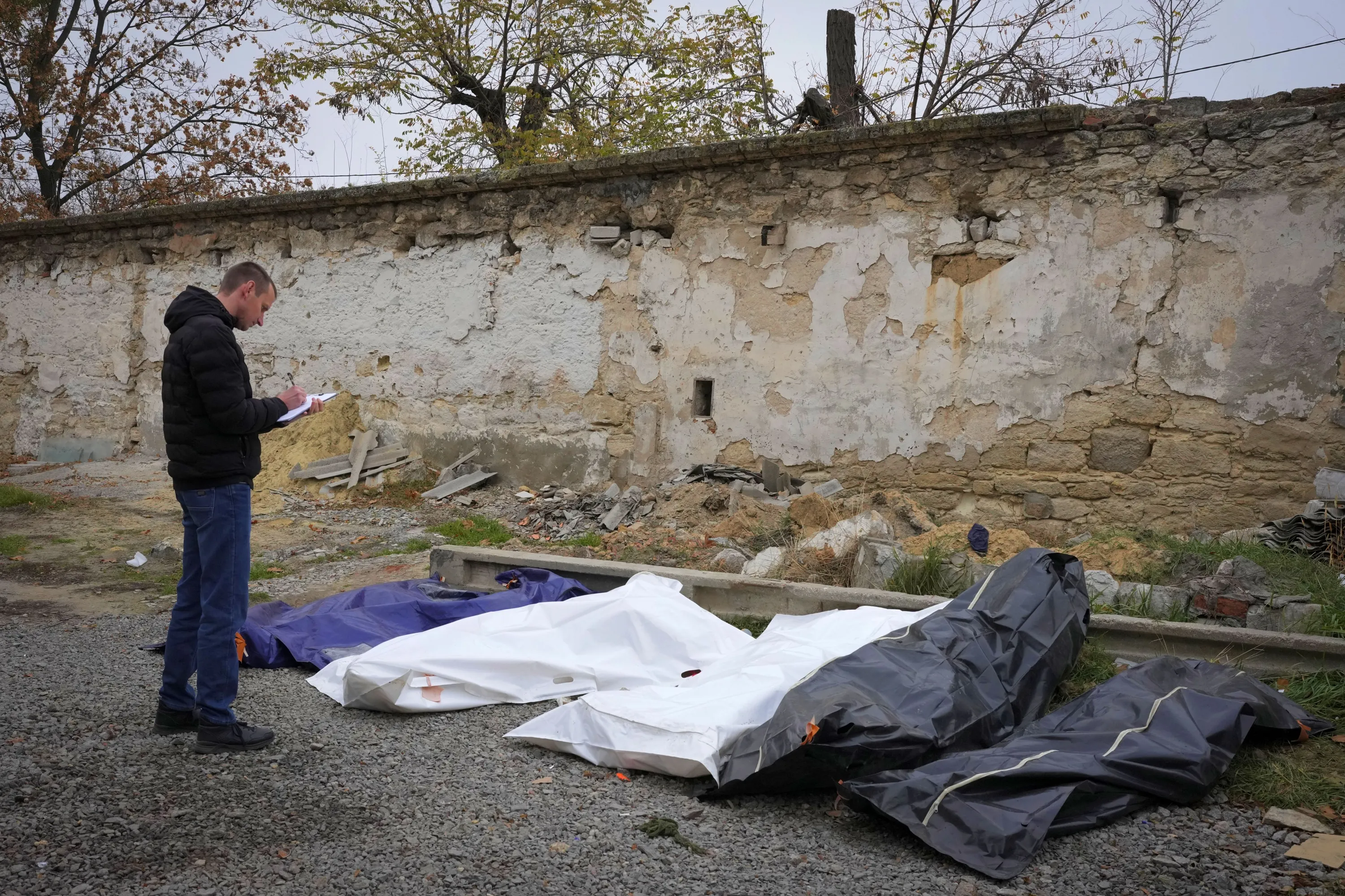 A criminologist examines bodies of civilians after a Russian shelling, at a city morgue in Mykolayiv, Ukraine, Saturday, November 12, 2022. (Photo by Efrem Lukatsky/AP Photo)