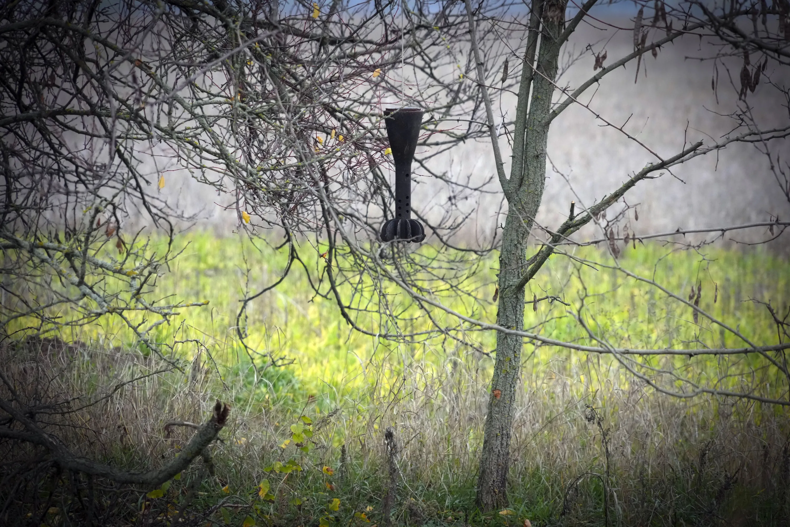A fragment of a shell hangs on a tree after heavy battles in the Mykolaiv region, Ukraine, Saturday, November 12, 2022. (Photo by Efrem Lukatsky/AP Photo)
