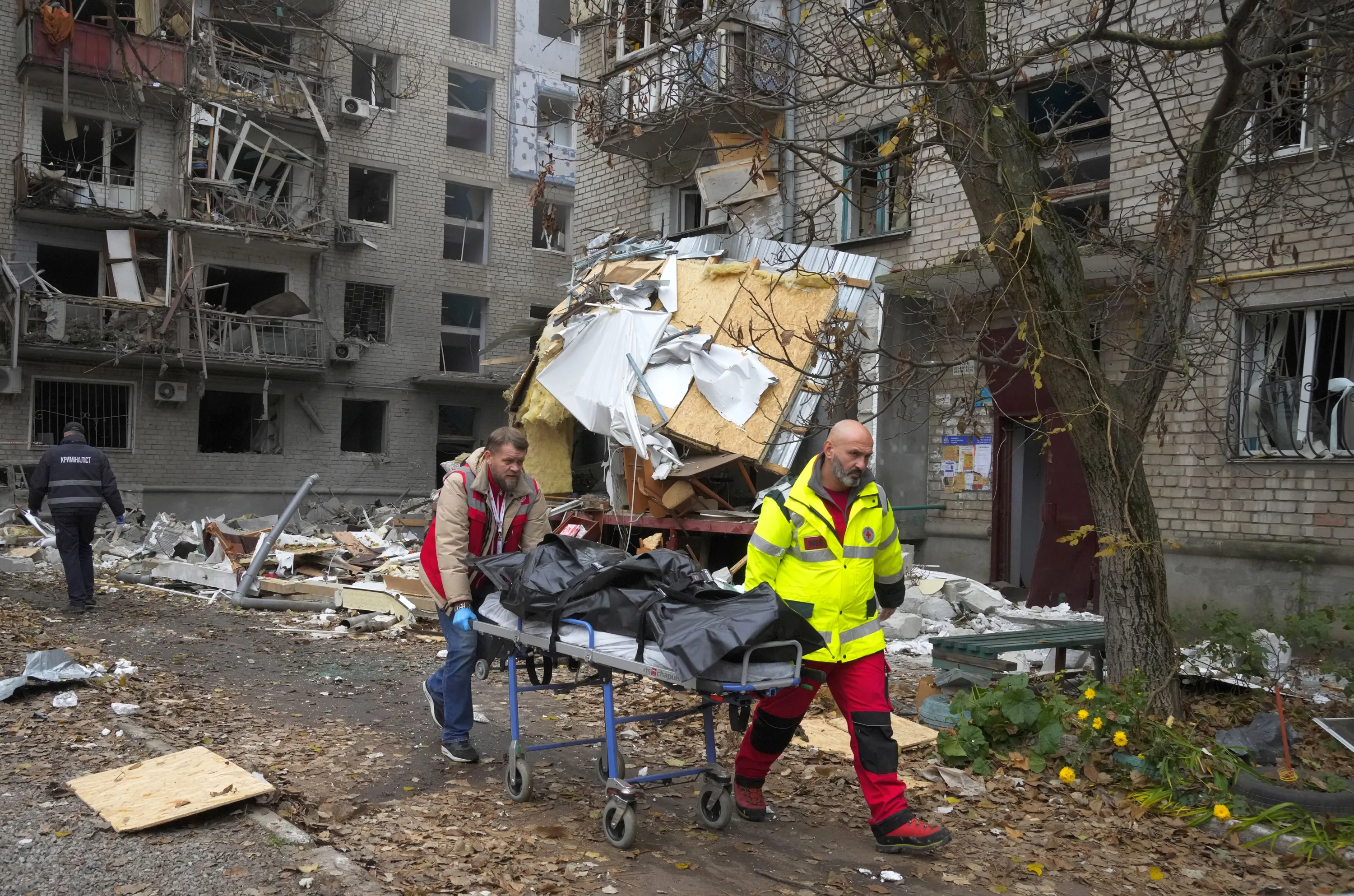 Medics carry the lifeless body of a victim found under rubble at the scene of night shelling in Mykolaiv, Ukraine, Friday, November 11, 2022. (Photo by Efrem Lukatsky/AP Photo)