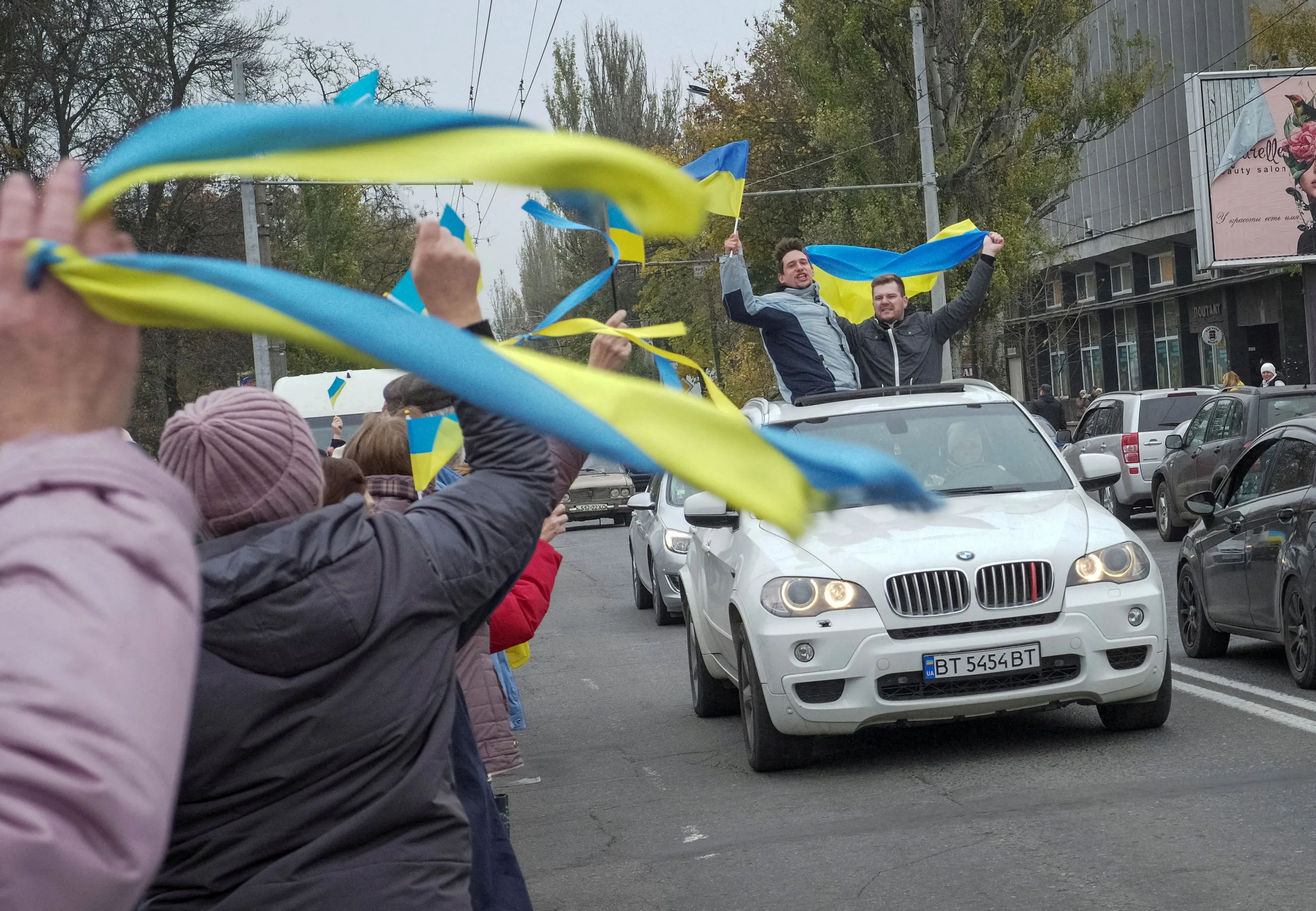 Local residents celebrate after Russia's retreat from Kherson, in central Kherson, Ukraine on November 12, 2022. (Photo by Lesko Kromplitz/Reuters)
