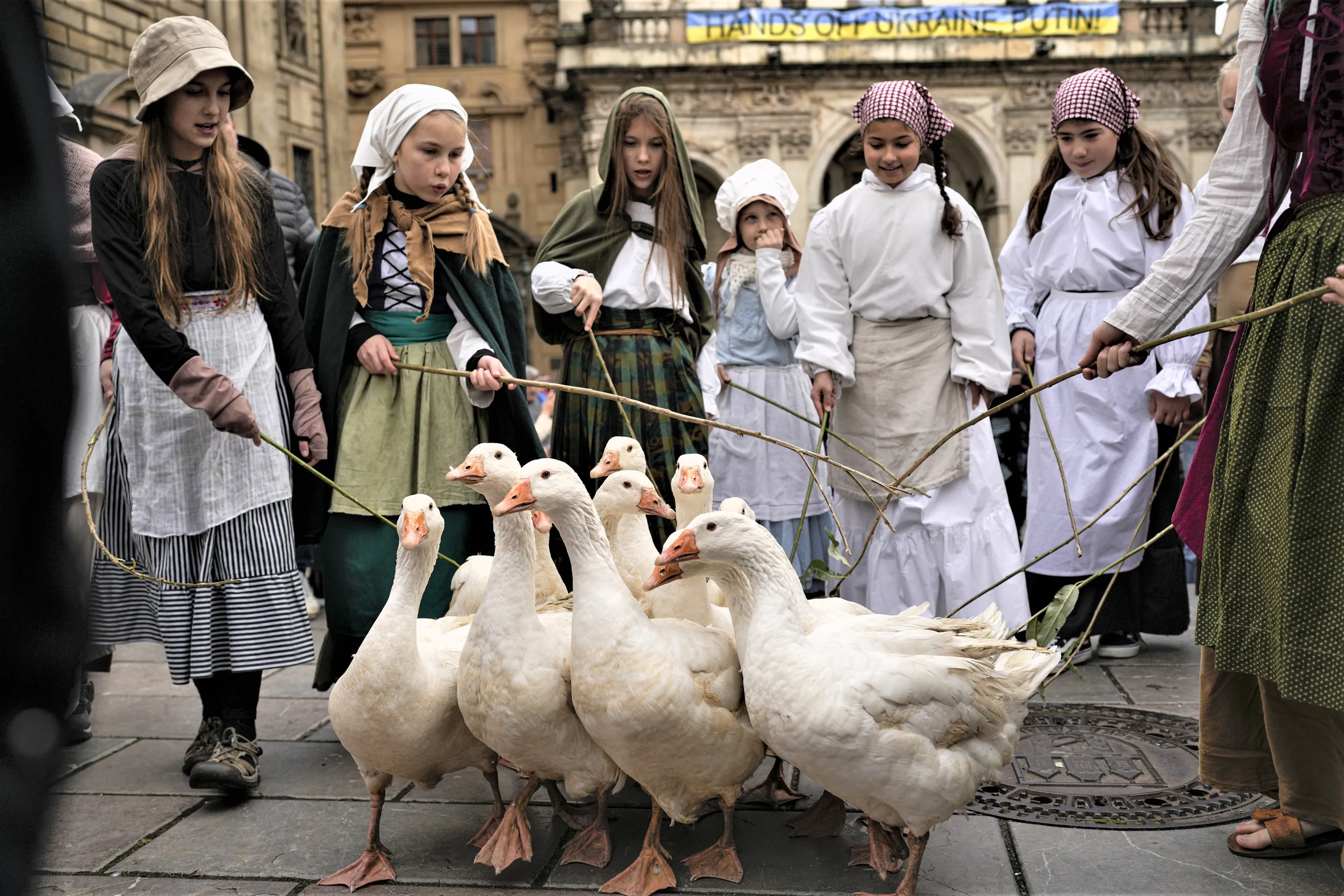 Girls lead a gaggle of geese, backdropped by a banner against the war in Ukraine, during a Saint Martin's Day procession next to Charles Bridge in Prague, Czech Republic, Friday, November 11, 2022. Saint Martin's day marks the end of the harvest season as well as the start of winter. (Photo by Vadim Ghirda/AP Photo)