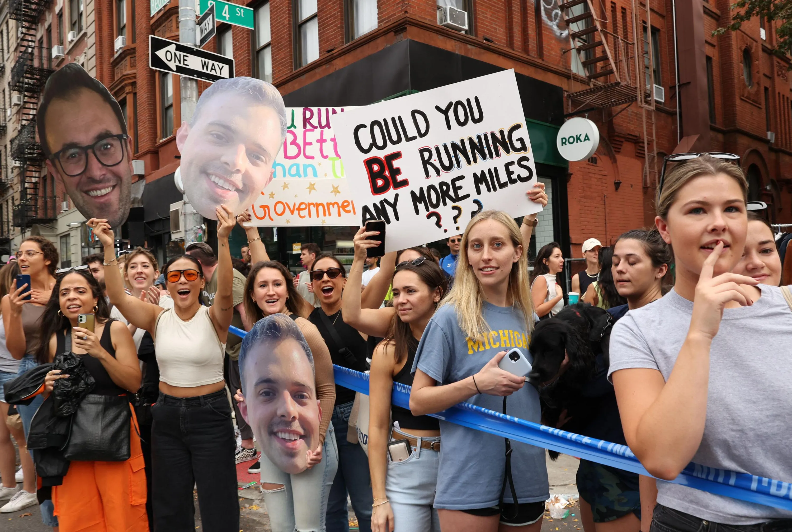 Spectators with signs watch runners in Harlem during the 2022 TCS New York City Marathon on November 06, 2022 in New York City. (Photo by Caitlin Ochs/Reuters)
