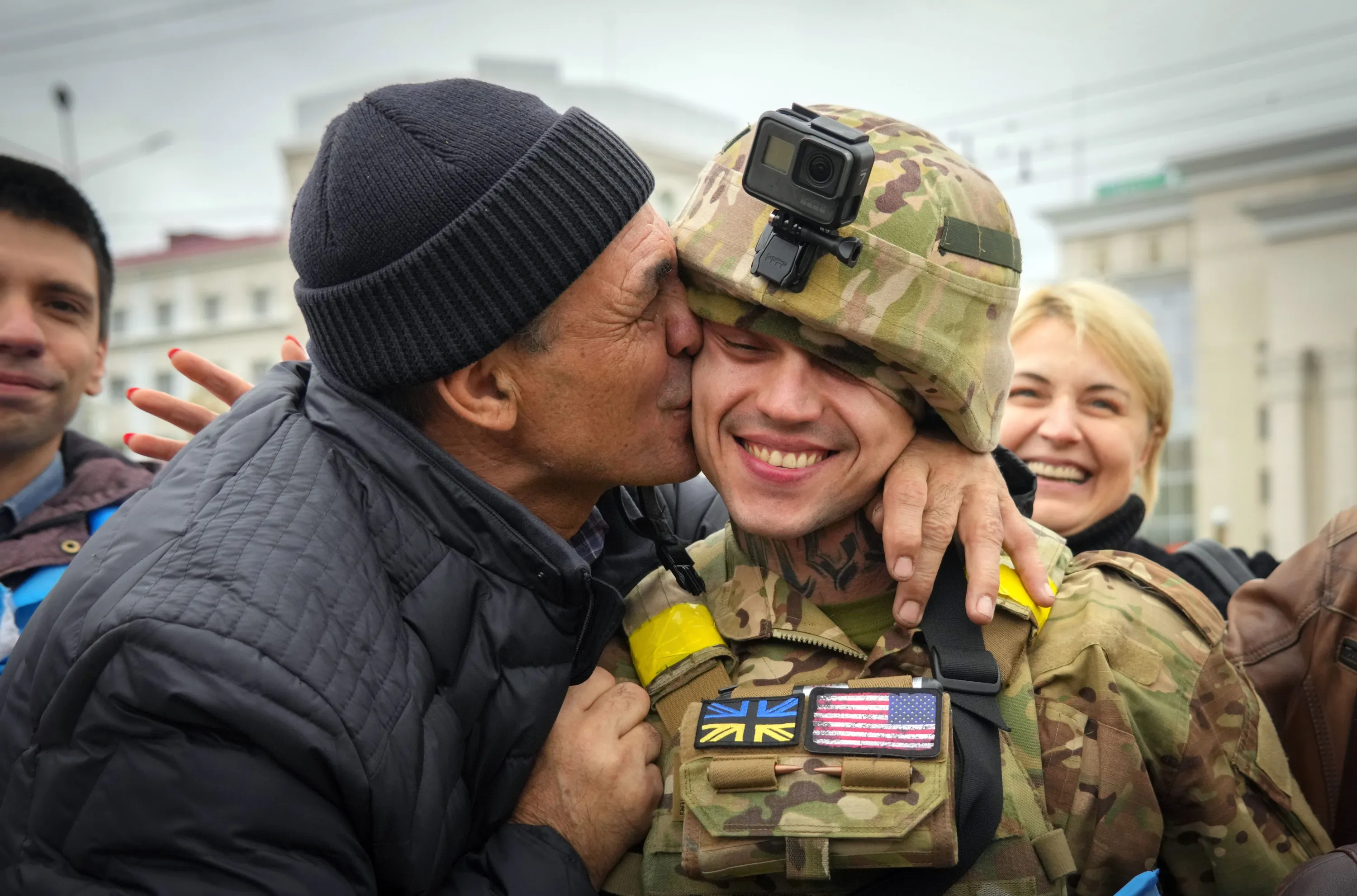A Kherson resident kisses a Ukrainian soldier in central Kherson, Ukraine, Sunday, November 13, 2022. The Russian retreat from Kherson marked a triumphant milestone in Ukraine's pushback against Moscow's invasion almost nine months ago. (Photo by Efrem Lukatsky/AP Photo)