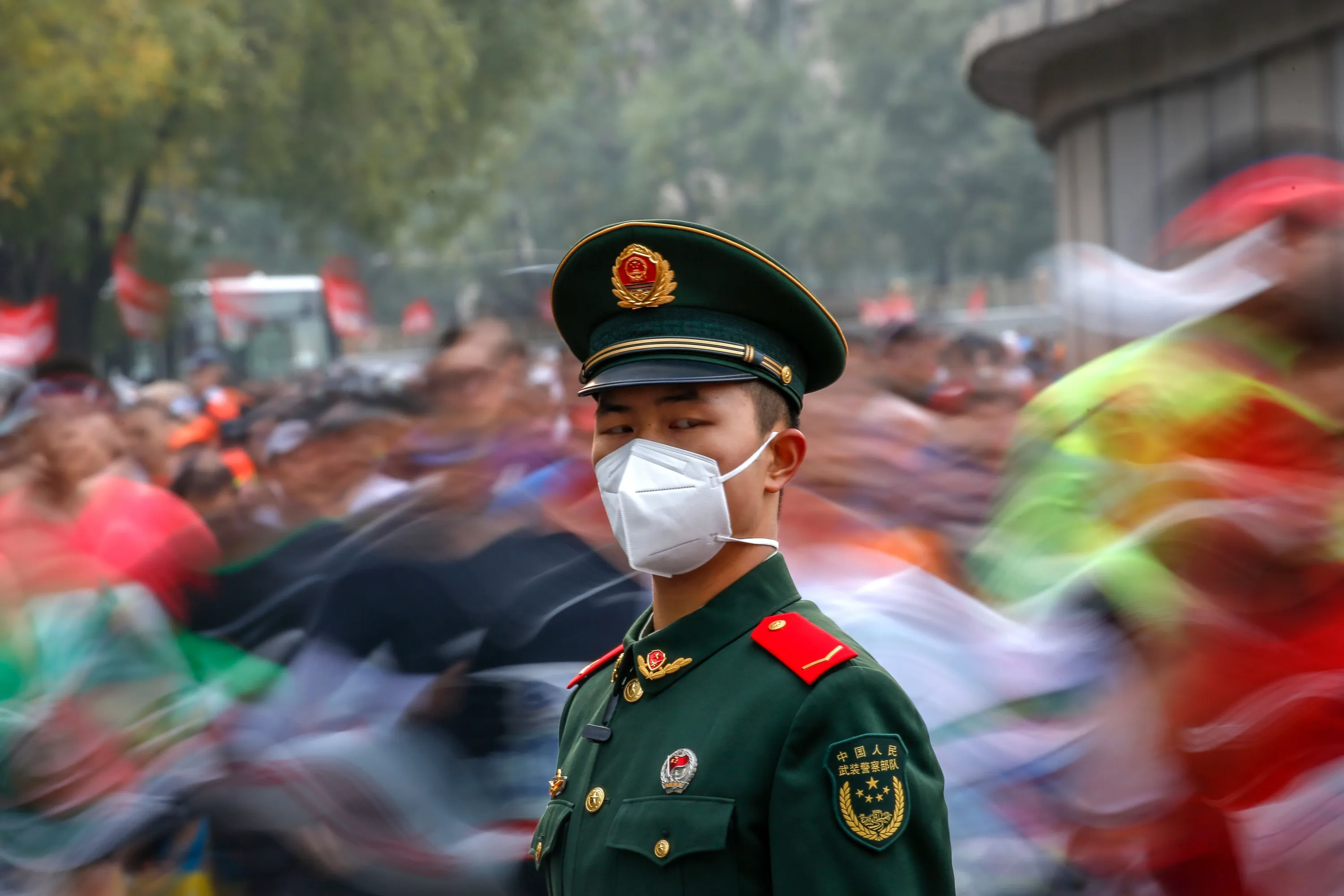 A soldier stands guard as runners compete during the Beijing Marathon in Beijing, China, 06 November 2022. The Beijing Marathon resumed after a two year hiatus following the COVID-19 pandemic. Participants were limited and were required to follow strict COVID-19 protocols before being able to join the race. (Photo by Mark R. Cristino/EPA/EFE/Rex Features/Shutterstock)