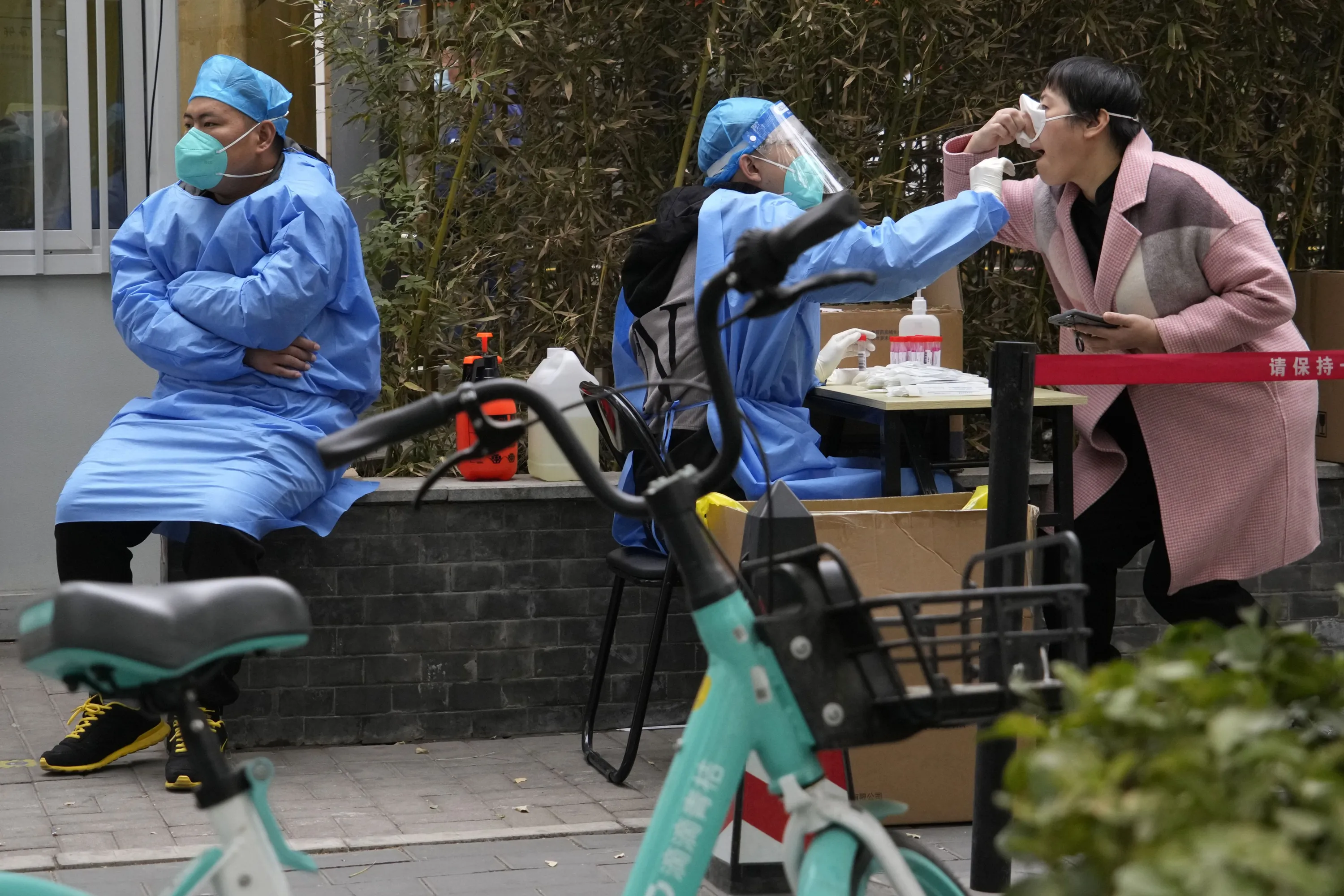 A woman lifts her mask to get swabbed for COVID test in Beijing, Sunday, November 6, 2022. (Photo by Ng Han Guan/AP Photo)