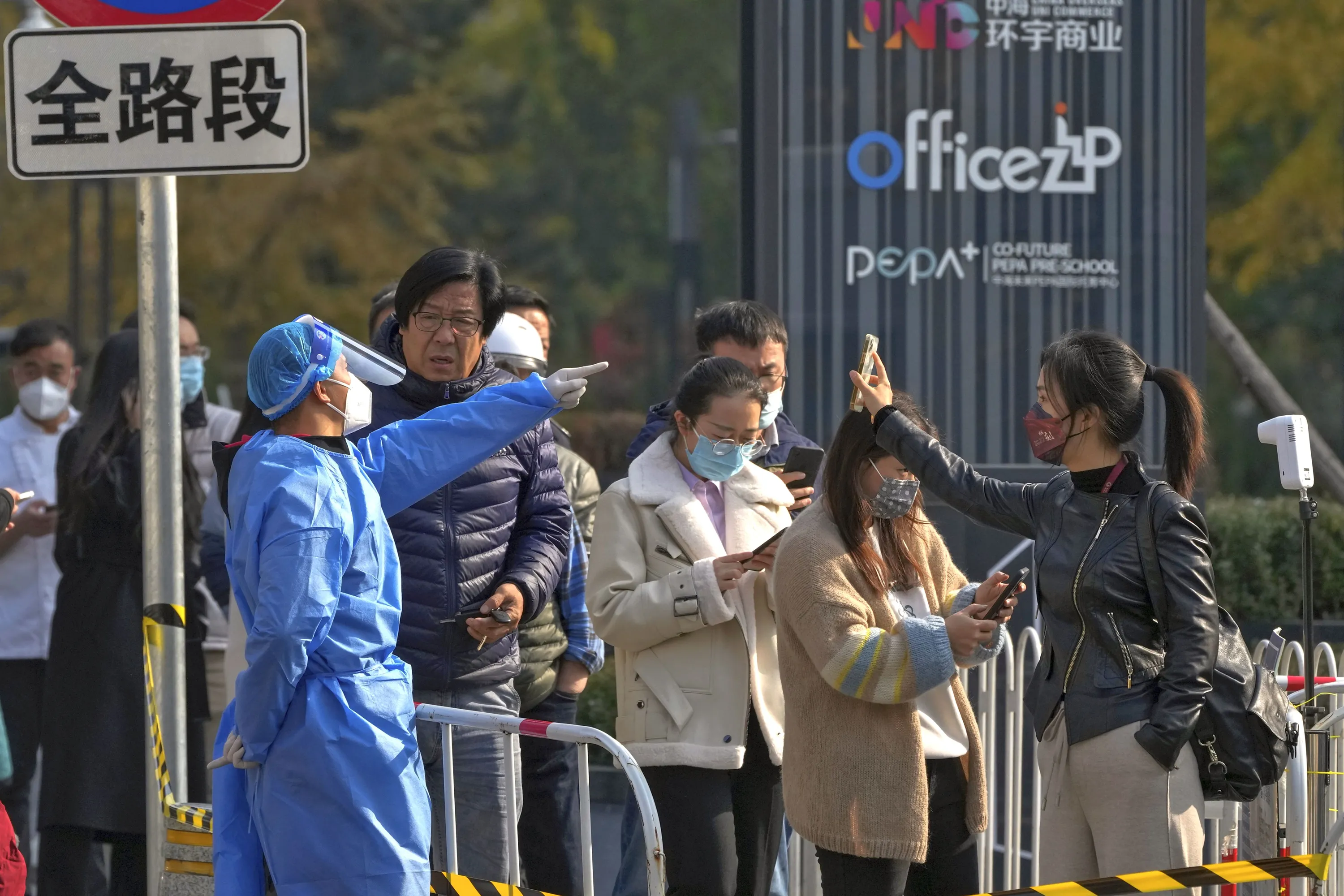 A woman, right, wearing a face mask shows her health check QR code as she and others line up to get their routine COVID-19 throat swabs at a coronavirus testing site in Beijing, Tuesday, November 8, 2022. Police in northeastern China say seven people have been arrested following a clash between residents and authorities enforcing COVID-19 quarantine restrictions. (Photo by Andy Wong/AP Photo)
