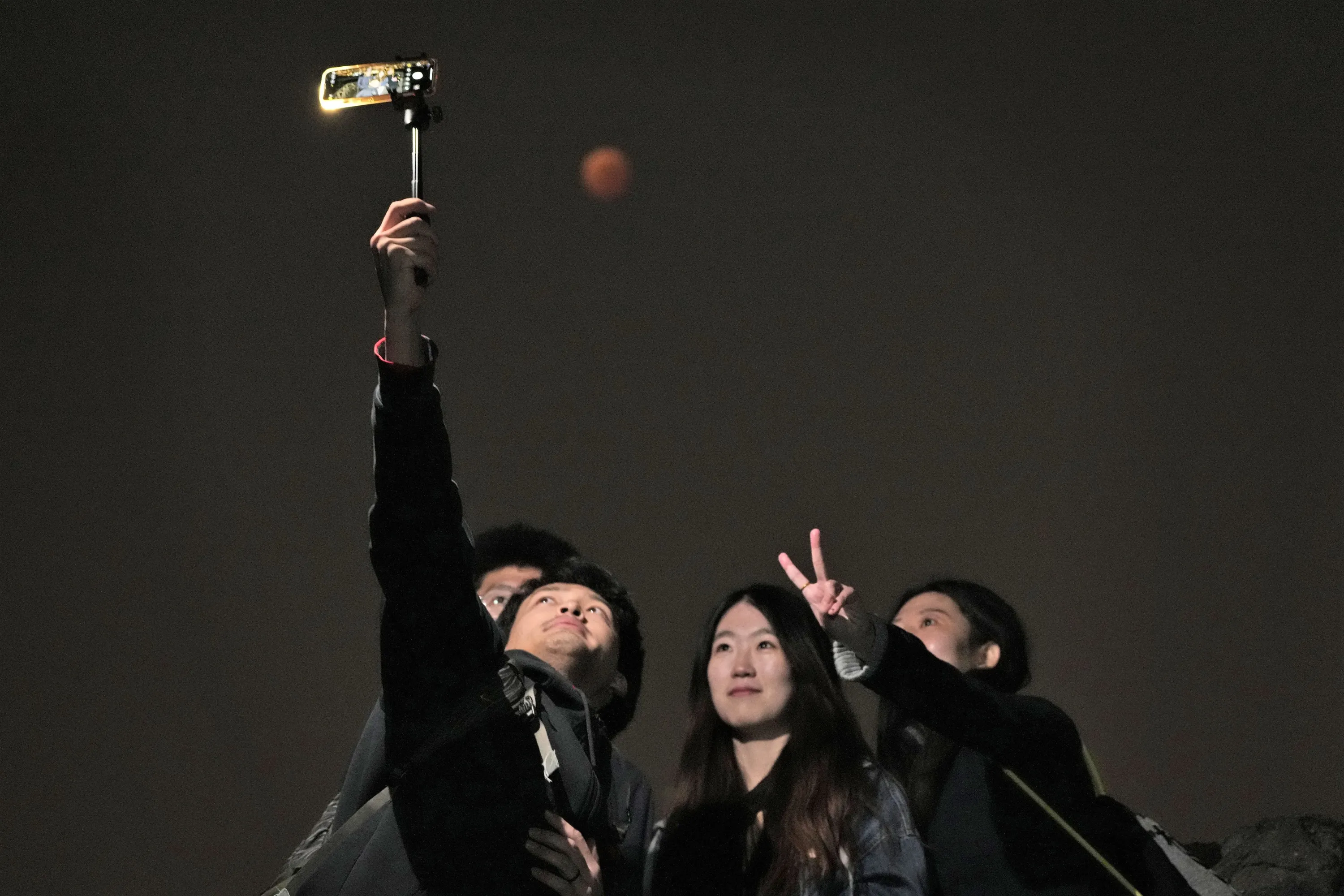 Residents pose for a selfie as the moon rises during a lunar eclipse in Beijing, China, Tuesday, November 8, 2022. (Photo by Ng Han Guan/AP Photo)