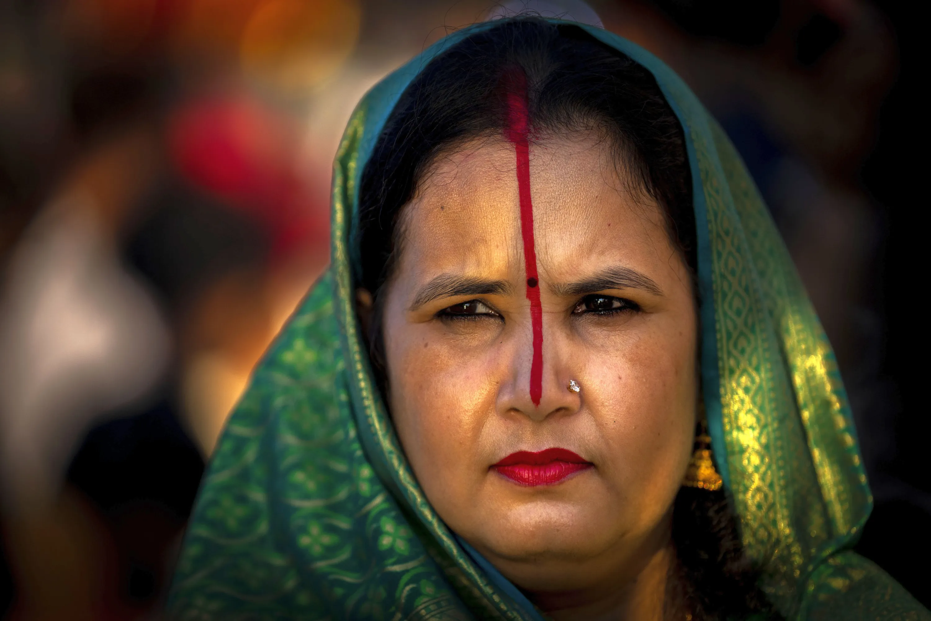 A Hindu devotee joins others gathering by the river Brahmaputra and offering prayers during Chhath Puja festival in Guwahati, northeastern Assam state, India, Sunday, October 30, 2022. During Chhath, an ancient Hindu festival, rituals are performed to thank the Sun god for sustaining life on earth. (Photo by Anupam Nath/AP Photo)