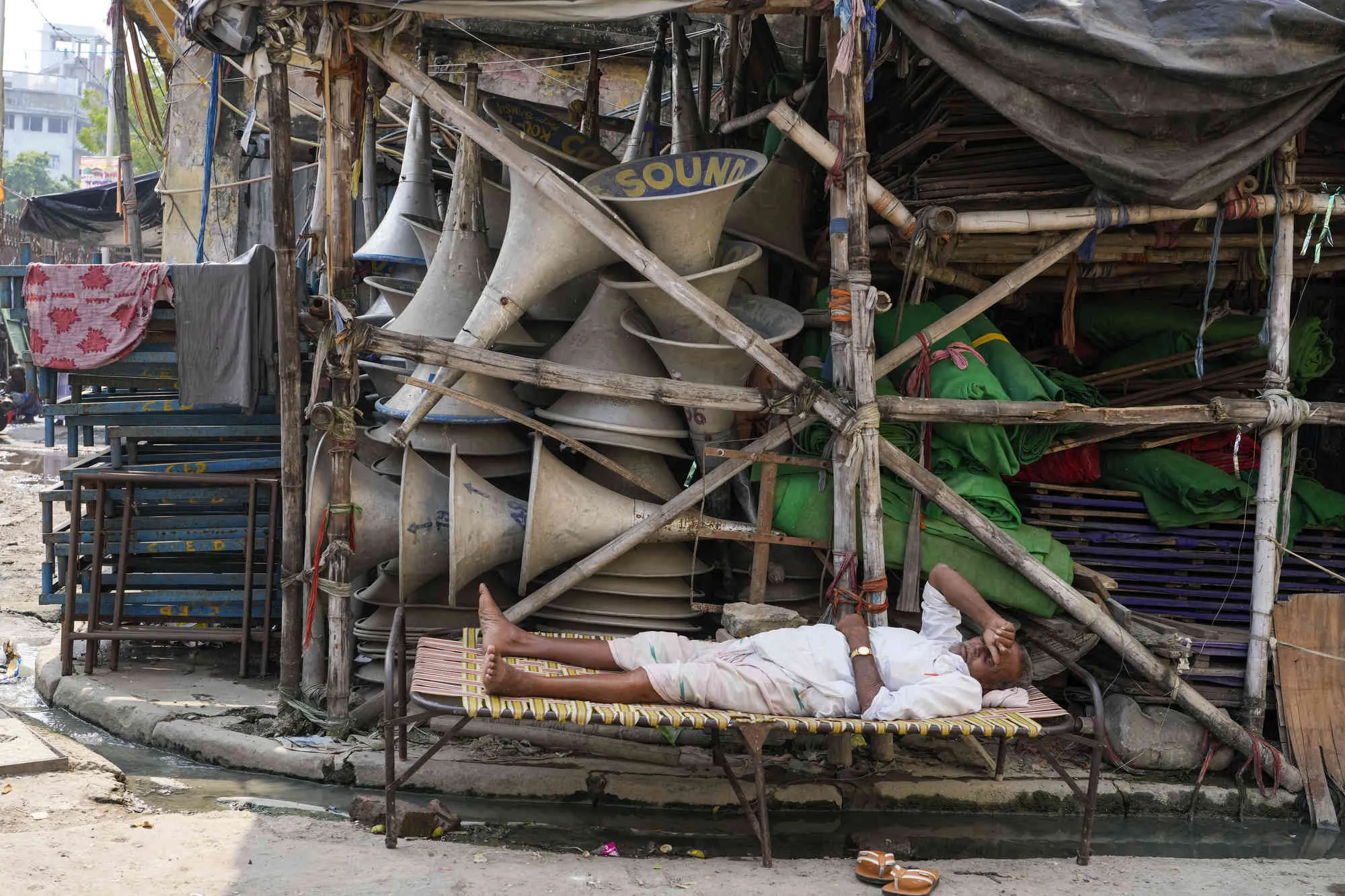 A man rests beside megaphones for hire in Kolkata, India, Friday, November 4, 2022. (Photo by Bikas Das/AP Photo)