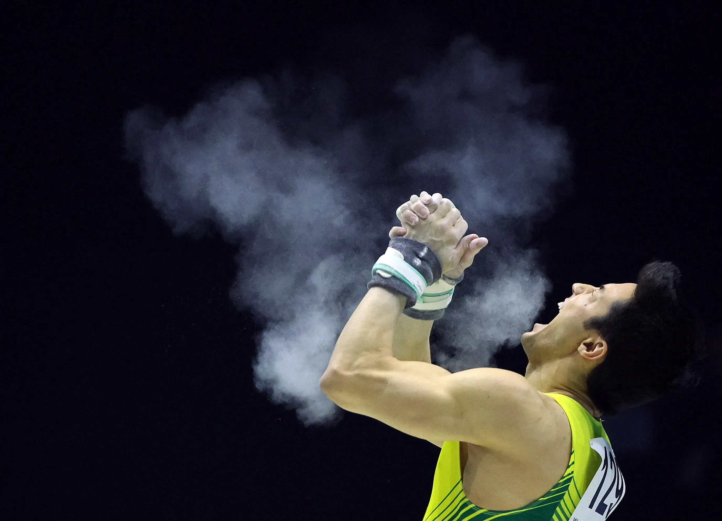 Brazil's Arthur Mariano celebrates after competing in the Men's Horizontal Bar final at the World Gymnastics Championships in Liverpool, northern England on November 6, 2022. (Photo by Phil Noble/Reuters)