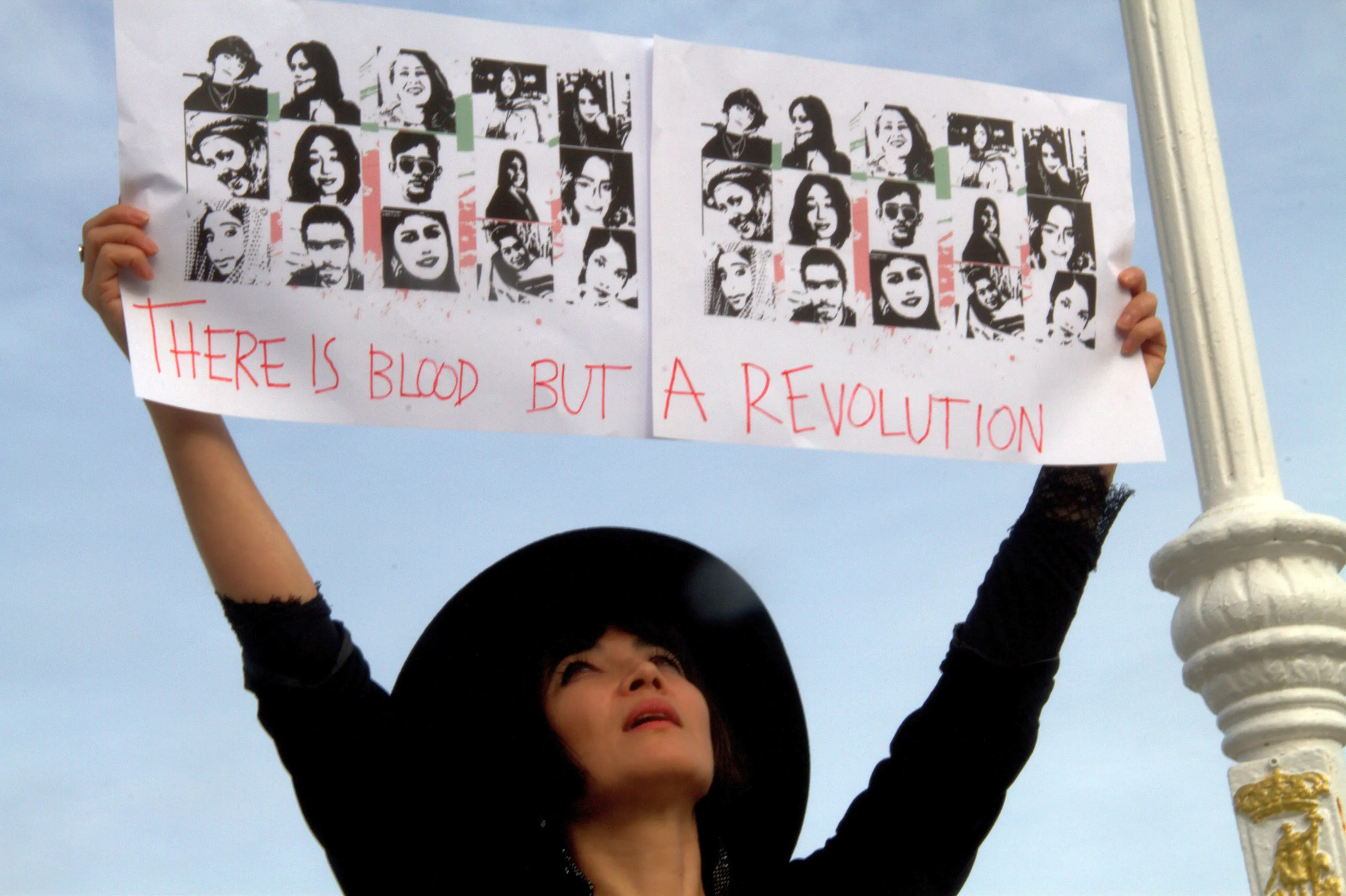 The Iranian filmmaker Mitra Farahani protests about the repression of women in Iran at the Gijón international film festival in Asturias, Spain on November 14, 2022, where she is showcasing her film See You Friday, Robinson. (Photo by Mercedes Menendez/Pacific Press/Rex Features/Shutterstock)