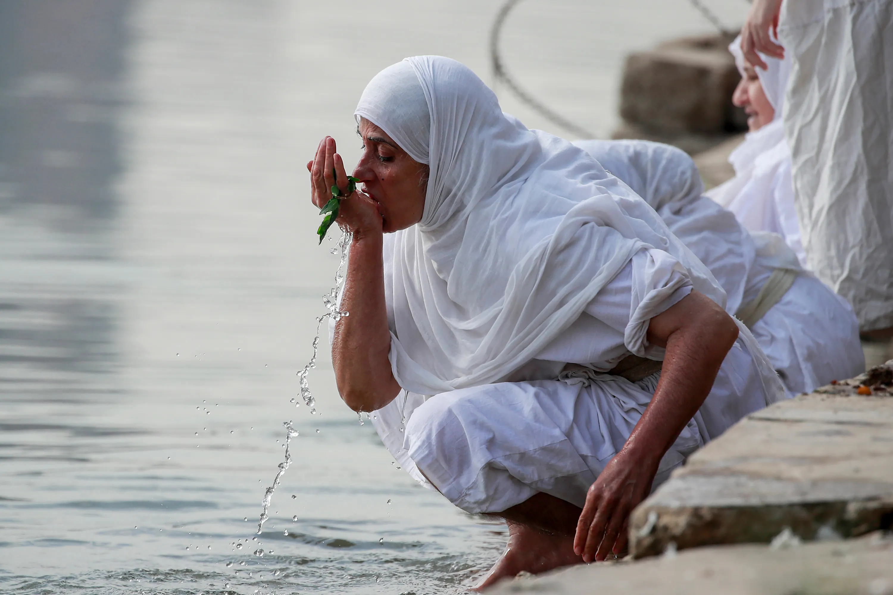 A woman in the Sabean Mandaean community takes part in a ritual during the Prosperity Day celebration in the Tigris River in central Baghdad, Iraq, Tuesday, November 1, 2022. (Photo by Hadi Mizban/AP Photo)
