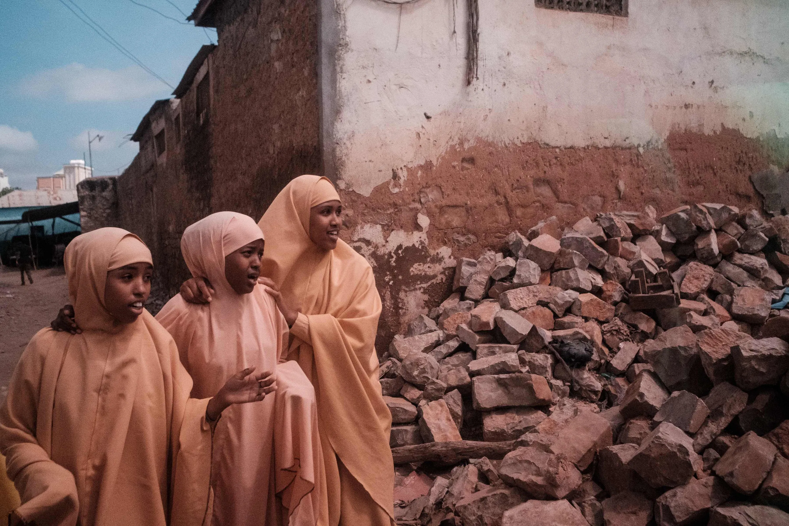 Girls dressed in local school uniform walk next to rubble along a street in Baidoa, Somalia, on November 9, 2022. After four consecutive failed rainy seasons, Somalia, Kenya and Ethiopia are in the midst of the worst period of drought for 40 years and with another poor rainy season is now likely to follow. Extreme drought has destroyed crops and led to the death of livestock. Combined with a high security threat from Al Shabaab that makes it hard to deliver aid, some 7 million Somalis, nearly half the population at risk of famine in Somalia. (Photo by Guy Peterson/AFP Photo)