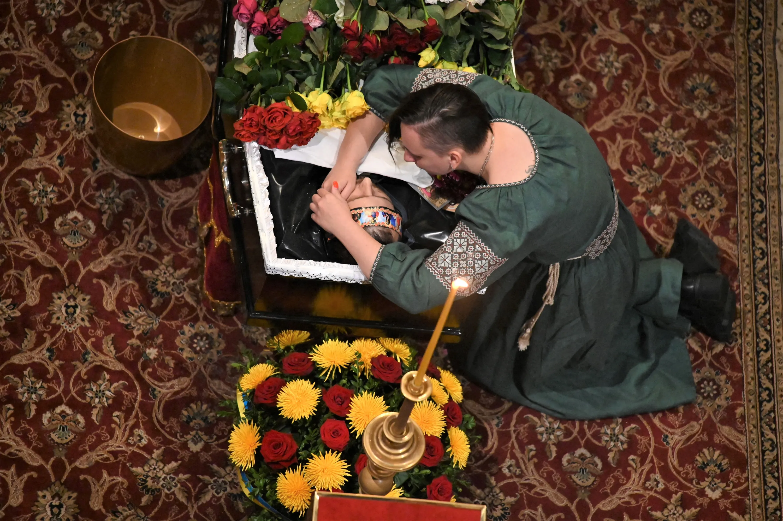 Yevgeniya mourns her husband, Ukraine's wellknown handball player Yevgen Kolesnichenko, who died near Bakhmut during a battle in the Donetsk region with Russian army troops, during a funeral ceremony at the Mykhaylo Golden Doms cathedral in Kyiv on November 16, 2022. (Photo by Sergei Supinsky/AFP Photo)