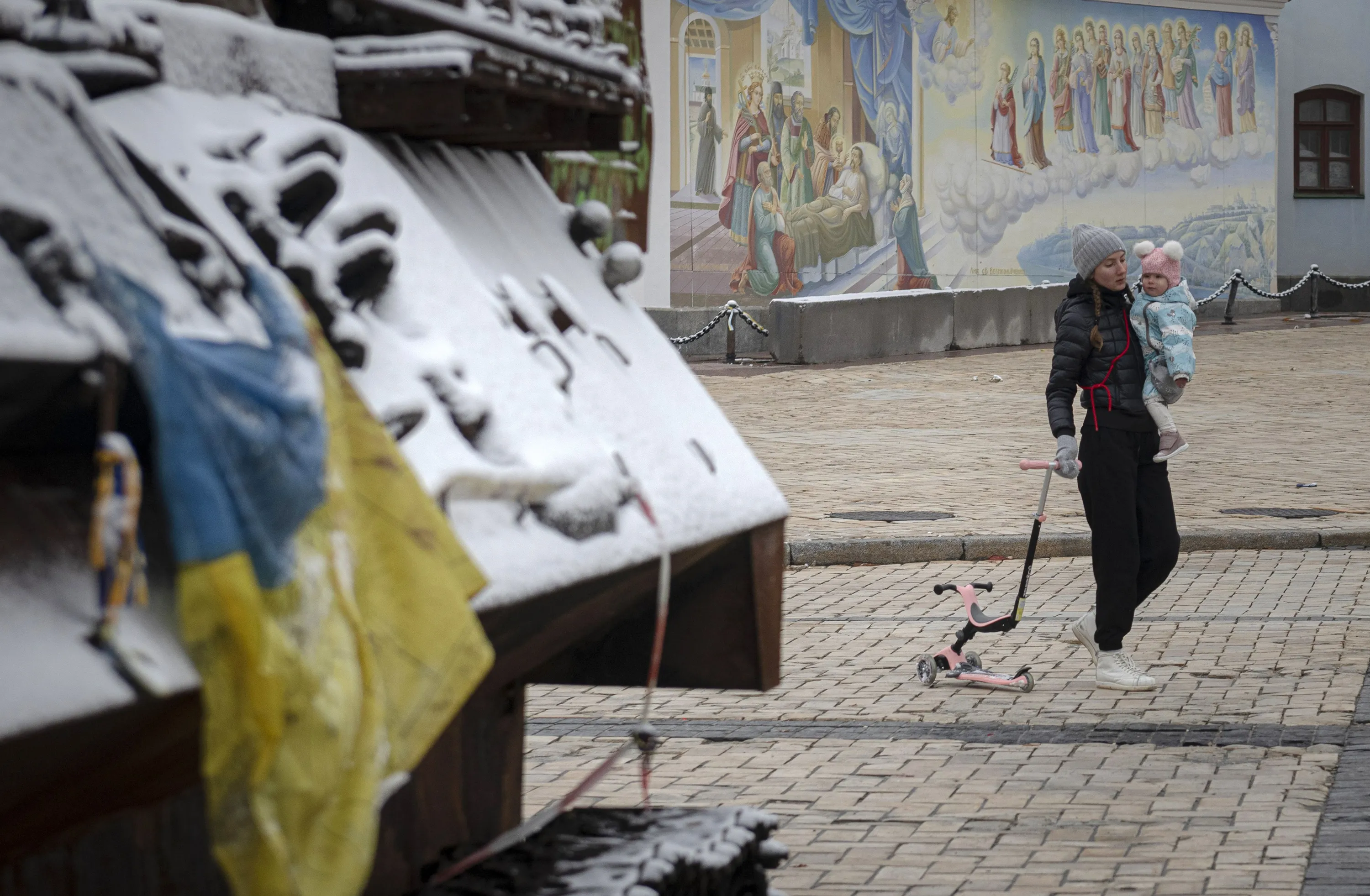 A woman walks past a display of destroyed Russian tanks and armoured vehicles after a snowfall in downtown Kyiv, Ukraine, Thursday, November 17, 2022. (Photo by Andrew Kravchenko/AP Photo)