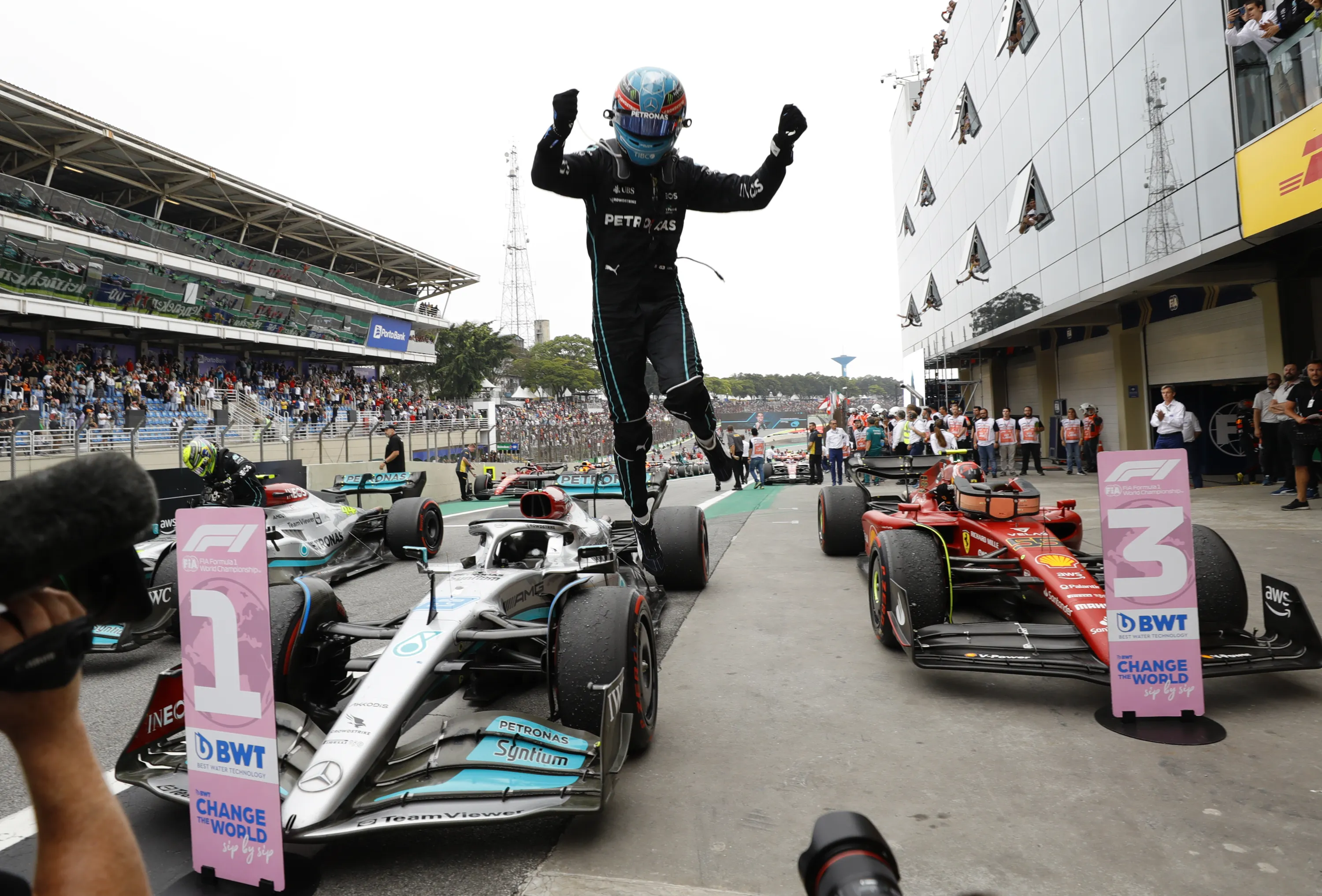 Mercedes driver George Russell, of Britain, celebrates his victory in the Brazilian Formula One Grand Prix at the Interlagos race track in Sao Paulo, Brazil, Sunday, November 13, 2022. (Photo by Marcelo Chello/AP Photo)