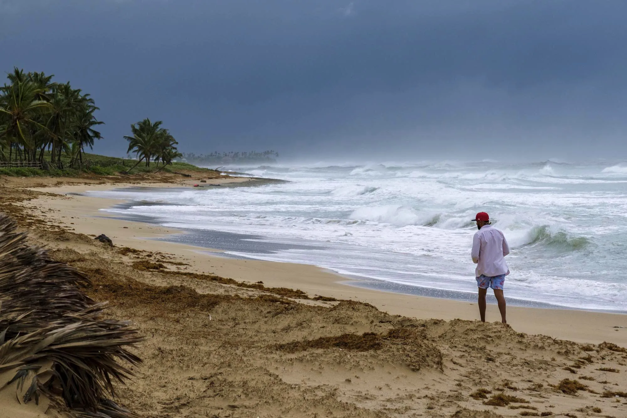 A man walks on the beach next to waves kicked up by Hurricane Fiona in Punta Cana, Dominican Republic, Monday, September 19, 2022. (Photo by Ricardo Hernandez/AP Photo)
