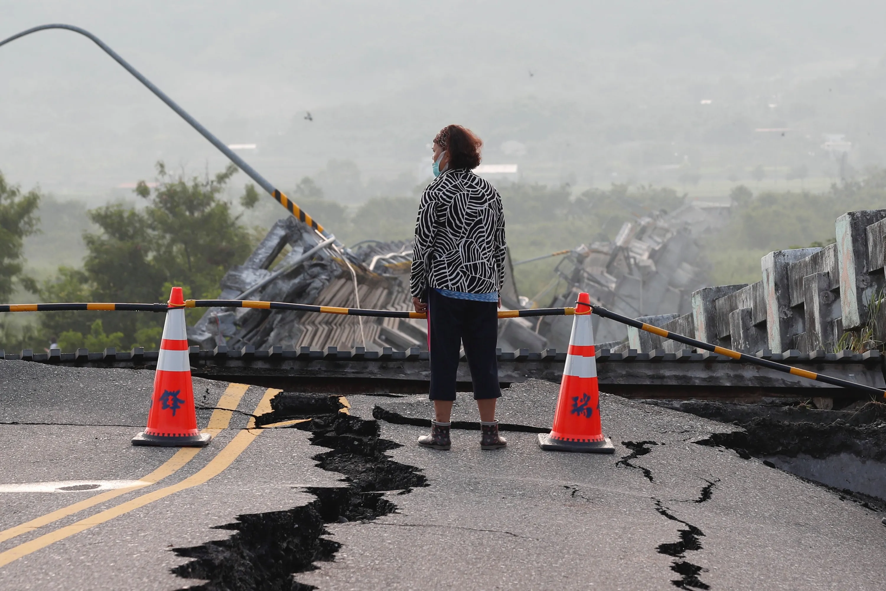 A Taiwanese resident inspects the damaged Gaoliao bridge that collapsed after a magnitude 6.8 earthquake hit Yuli Township; in Hualien County, Taiwan, 19 September 2022. The series of earthquakes and aftershocks on 18 September, caused minor structural damage and derailed a train in eastern Taiwan. (Photo by Ritchie B. Tongo/EPA/EFE)