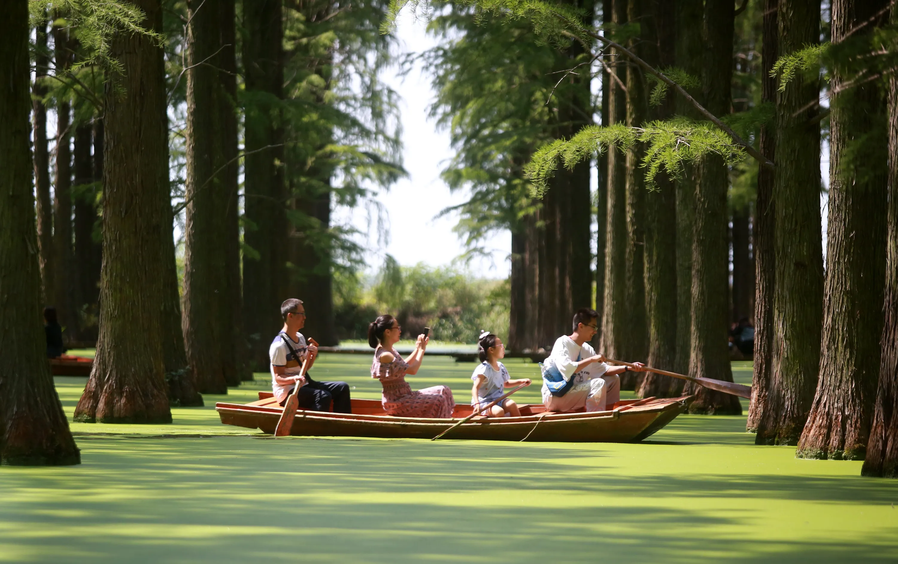 Tourists take a boat ride at an aquatic forest of Luyang Lake Wetland Park during the Mid-Autumn Festival holiday on September 12, 2022 in Yangzhou, Jiangsu Province of China. (Photo by VCG/VCG via Getty Images)