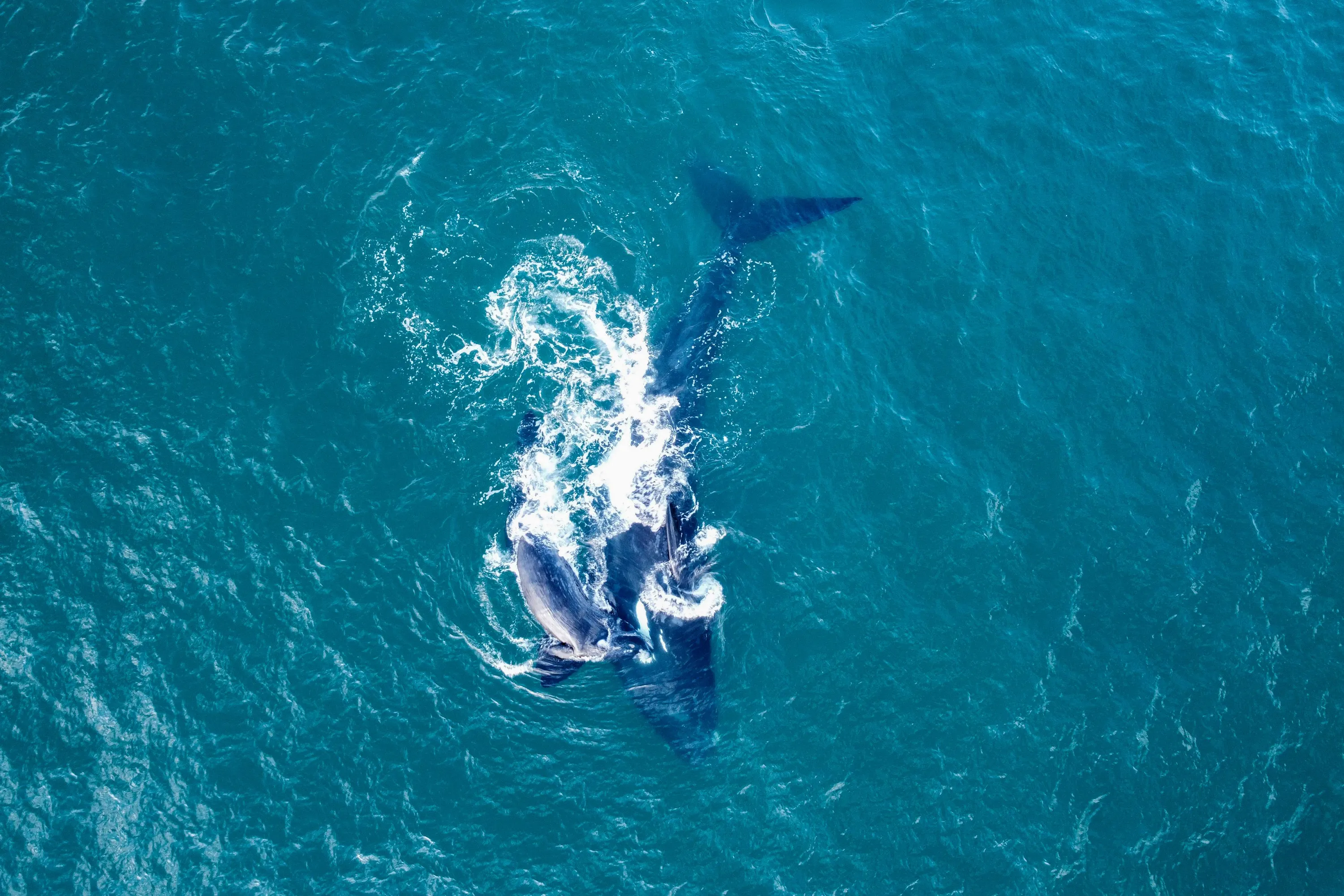 This aerial view shows southern right whales (Eubalaena australis) swimming off the coast of Infanta, near the Breede River estuary, on October 21, 2022. (Photo by Wikus de Wet/AFP Photo)