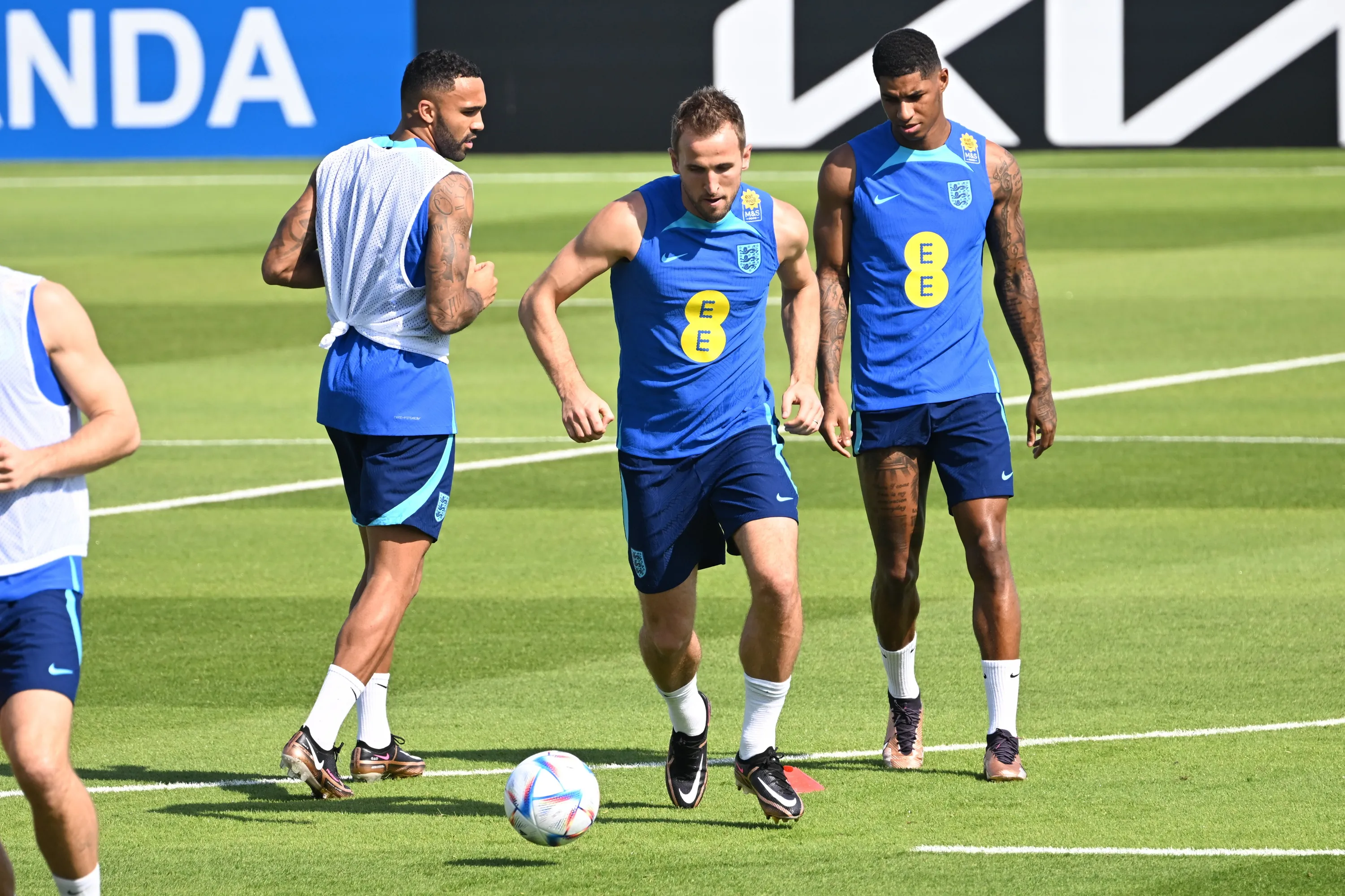 England's Harry Kane, with Marcus Rashford and Callum Wilson during a training session at the Al Wakrah Sports Club Stadium, Al Wakrah, Qatar on Thursday, November 17, 2022. (Photo by Nick Potts/PA Images via Getty Images)