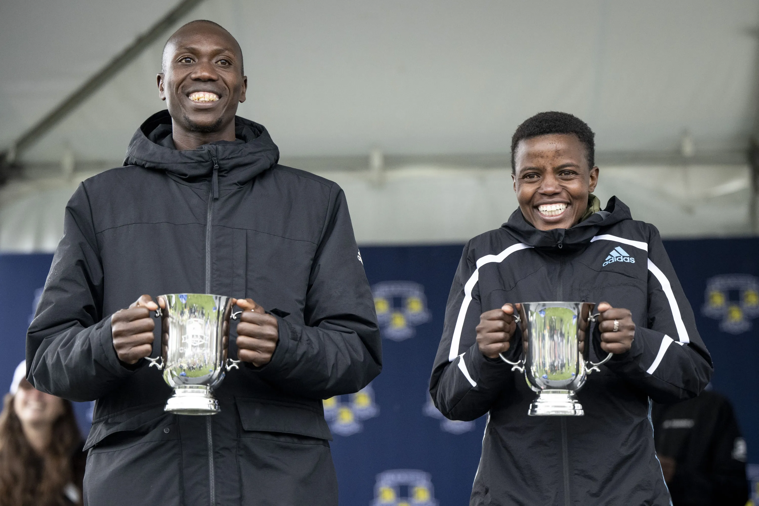 Geoffrey Koech and Viola Chepngeno of Kenya pose for a photo on the podium after winning the 2022 B.A.A. Half Marathon on November 13, 2022 in Boston, Massachusetts. (Photo by Maddie Malhotra/Getty Images)