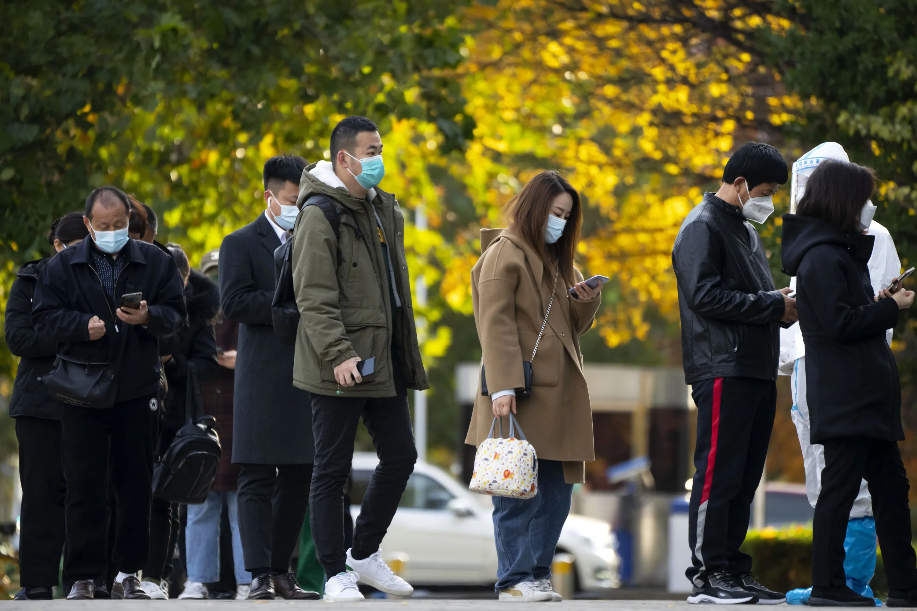 People wearing face masks stand in line for COVID-19 tests at a coronavirus testing site in Beijing, Wednesday, November 16, 2022. (Photo by Mark Schiefelbein/AP Photo)